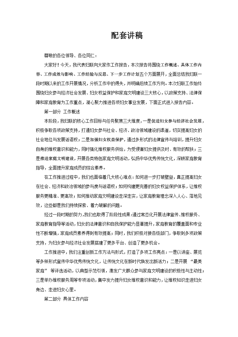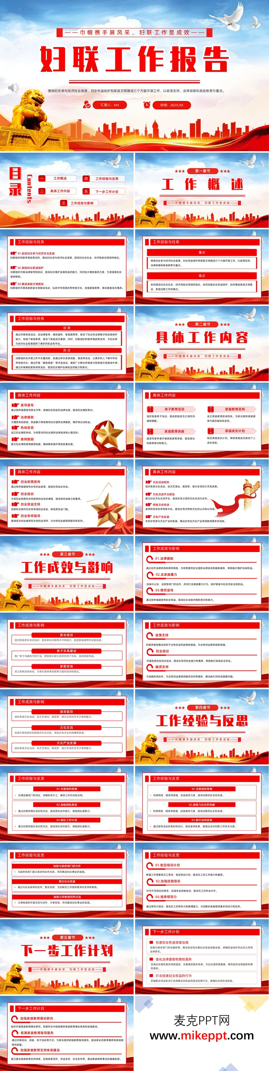 这份PPT文档的标题为“巾帼携手展风采,妇联工作显成效”,其核心是一份妇联工作报告。文档结构清晰,总共分为五个主要章节,系统地回顾、总结并规划了妇联的各项工作。 报告首先在第一章“工作概述”中明确了总体框架,指出工作围绕妇女参与经济社会发展、妇女权益保护和家庭文明建设三大核心领域展开,并将政策支持、法律保障和家庭教育作为重点抓手,同时也指出了工作中的难点。 在第二章“具体工作内容”中,报告详细阐述了四大板块的举措: 1.妇女权益保护:包括法律宣导、法律援助、设立维权热线和案例跟踪。 2.家庭文明建设:涵盖亲子教育活动、家庭教育讲座、提供咨询服务和制定家庭成长计划。 3.妇女创业支持:涉及创业政策宣传、创业培训、资金支持和导师指导。 4.妇女文化建设:包括组织文化活动、搭建交流平台、传承传统文化和支持文化产业发展。 第三章“工作成效与影响”展示了在上述领域的实际成果,如成功提供法律援助、开展反家暴合作、提升家长教育能力、为女性创业者提供融资支持以及通过文化活动展示女性风采等。 第四章“工作经验与反思”总结了取得成效的关键因素,包括完善组织架构、加强团队建设、利用媒体扩大宣传、整合社会资源以及重视员工培训与领导力培养。 最后,第五章“下一步工作计划”规划了未来的工作方向,重点在于继续完善妇女权益保障法规、强化维权服务、加强家庭教育体系建设、优化女性创业政策支持以及推动妇女在文化交流与传承中发挥更大作用。 总而言之,这份报告全面展示了妇联组织在推动妇女发展、维护妇女权益、促进家庭和谐与社会进步方面所开展的系统性工作和取得的显著成效。