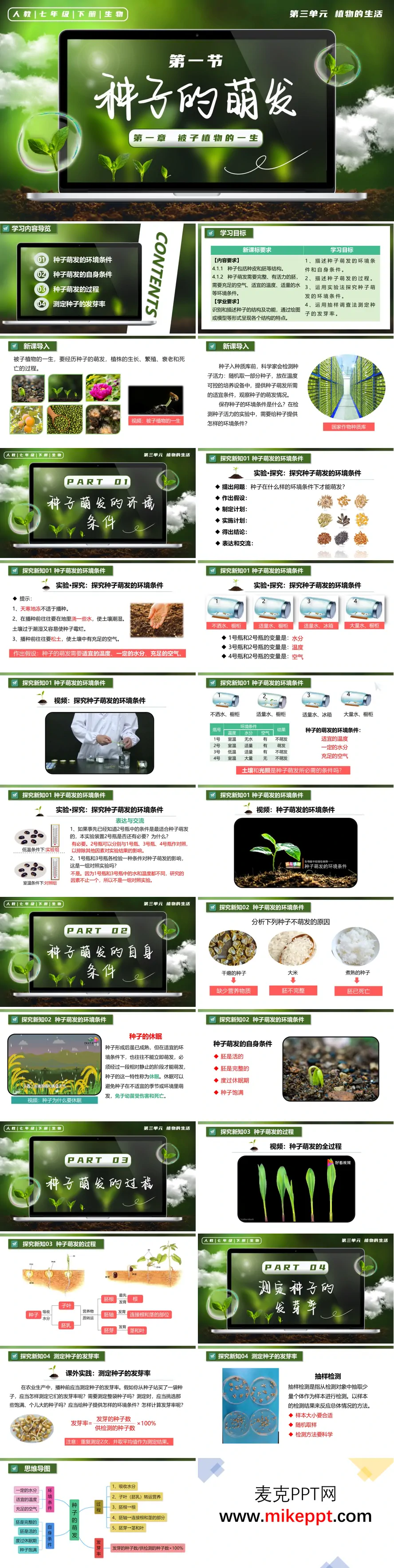 这是一套专为人教版七年级下册生物课程设计的《种子的萌发》教学课件,整体风格清新自然,大量运用实验示意图与实物拍摄图片,有效降低学生的认知难度。课件以被子植物完整生命周期作为宏观背景导入,自然聚焦种子萌发这一关键起始阶段,凸显其在植物个体发育中的重要地位。核心探究环节采用对照实验方法,系统验证种子萌发的环境条件:通过多组变量控制实验,科学得出适宜的温度、一定的水分和充足的空气是种子萌发不可或缺的外界条件,同时澄清土壤和光照并非必需条件的常见误区。在自身条件分析中,课件强调胚的活性与完整性是萌发的内在基础,种子需度过休眠期且籽粒饱满,并逐一剖析干瘪种子营养不足、大米胚受损、煮熟种子蛋白质变性等不萌发的具体原因,培养学生辩证分析能力。种子萌发过程以动态图示呈现:种子首先吸收水分膨胀,子叶或胚乳中的营养物质转运至胚,随后胚根率先突破种皮发育成根,胚轴伸长连接根与茎,胚芽最终发育为茎和叶,完整展现胚各部分的发育去向。实践应用环节详细介绍测定种子发芽率的抽样检测方法,规范演示随机取样、培养观察、统计计算的完整流程,给出科学计算公式。课件末尾以思维导图整合知识框架,配合分层随堂检测及时反馈学习成效,整体编排遵循"情境导入—实验探究—条件分析—过程解析—实践应用"的认知逻辑,非常适合课堂探究式教学。