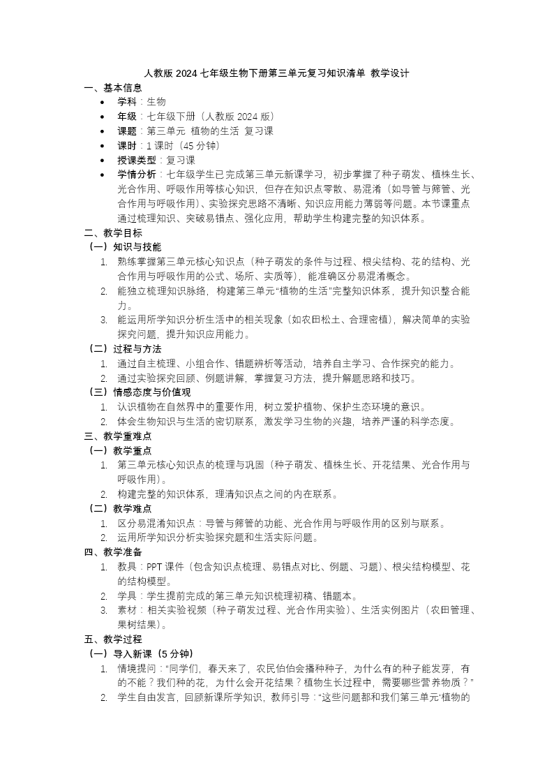 人教版七年级下册生物"植物的生活"单元复习课件,以系统化知识网络图为统领,有机整合种子萌发、植株生长、生殖发育、水分代谢、能量转换及生态功能七大核心模块。在种子生理板块,通过设置温度、水分、空气三变量对照实验,科学论证萌发的外界条件,并动态演示胚根突破种皮形成根系、胚轴伸长拱出土面、胚芽舒展发育成茎叶的完整过程;在营养生长板块,借助根尖显微结构解析根冠保护、分生区增殖、伸长区延伸、成熟区吸收的功能分区,结合叶芽纵切示意图说明芽轴伸长成茎、幼叶展开成叶、芽原基分化成侧芽的枝条发育规律,同时强调氮磷钾等矿质元素对植物代谢的调控作用;在生殖发育板块,以花蕊结构为起点,梳理传粉媒介类型、双受精机制及子房壁发育成果皮、胚珠发育成种子的果实形成路径;在水分代谢板块,阐明蒸腾作用产生的蒸腾拉力是水分长距离运输的主要动力,并分析气孔开闭对散热降温的调节意义;在能量转换板块,通过经典实验对比和反应式推演,揭示光合作用将光能转化为化学能、合成有机物并释放氧气,呼吸作用分解有机物释放能量供生命活动的辩证关系;在生态功能板块,总结绿色植物作为生态系统初级生产者,在维持大气碳氧平衡、驱动生物圈水循环、为其他生物提供物质能量基础等方面的不可替代性。课程配套阶梯式随堂检测,诊断知识掌握程度,促进学生形成结构与功能相适应、局部与整体相统一的生物学观念。