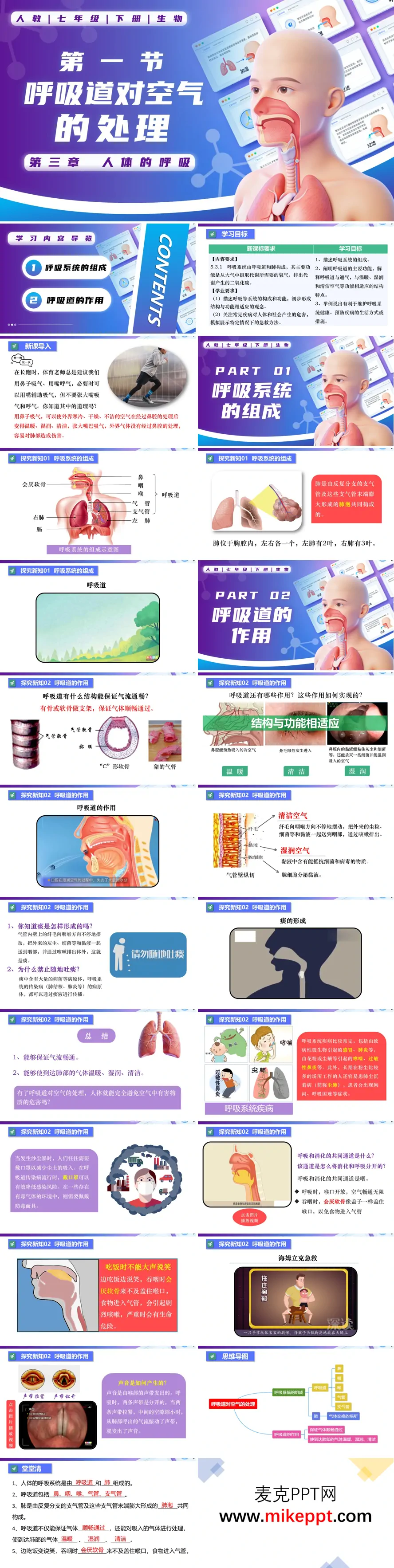 人教版七年级下册生物"呼吸道对空气的处理"课件,以"长跑时用鼻呼吸更科学"这一运动常识为切入点,引发学生对呼吸道功能的深度思考。课件首先构建呼吸系统整体认知框架,明确界定呼吸道由鼻、咽、喉、气管、支气管组成的传导气道,以及由亿万个肺泡构成的肺作为气体交换核心器官的结构分工。随后聚焦呼吸道的三重处理机制:骨性支架方面,"C"形软骨环的巧妙排列既维持气道开放状态又兼顾吞咽时的弹性形变;温度调节方面,鼻腔黏膜丰富的毛细血管网对吸入冷空气进行预热,避免肺泡受低温刺激;净化防御方面,鼻毛构成物理屏障拦截粉尘颗粒,黏液腺分泌湿润分泌物黏附病原体,气管内壁纤毛定向摆动形成"黏液-纤毛 escalator"将异物推向咽部排出,多维度体现生物学"结构与功能相适应"的核心观念。课件还延伸生活健康指导:解析会厌软骨在吞咽与呼吸协调中的关键作用,阐明进食时说笑导致食物误入气管引发呛咳的生理机制;演示海姆立克急救法的操作要领以应对气道异物梗阻;说明喉部声带振动频率决定音调高低的声学原理;列举哮喘、慢性阻塞性肺病、肺炎等常见呼吸系统疾病的诱因与预防策略。课程以结构化思维导图整合知识网络,配合情境化随堂检测评估学习成效,助力学生建立呼吸道健康维护的自觉意识。