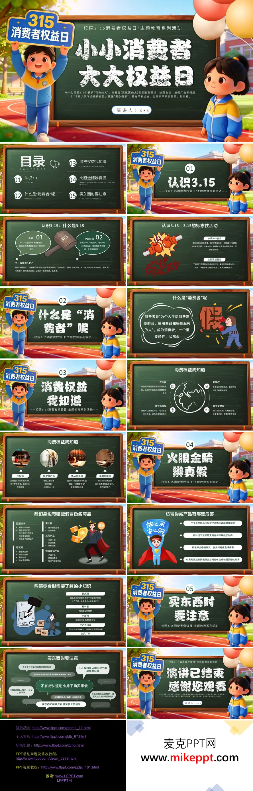 这套PPT是关于校园"3·15消费者权益日"的主题教育课件,共17页,采用卡通风格设计,以黑板、操场为背景,配合两个穿着蓝黄校服的3D卡通学生形象贯穿始终。 PPT分为五个主要部分:认识3.15介绍了国际消费者权益日的由来、中国自1987年加入后的行动,以及央视315晚会、全国维权行动等标志性活动;什么是"消费者"解释了消费者的定义——为个人生活消费需要购买、使用商品和接受服务的人;消费权益我知道详细列举了安全权、知情权、自主选择权、公平交易权、求偿权、维护尊严权、依法结社权、求教获知权等八大权益;火眼金睛辨真假列举了盗版绘本、毒文具、毒玩具、三无产品、假冒商标产品等身边常见的假冒伪劣商品及其危害,并教授购买零食时识别保质期、配料表、条形码、生产许可证等实用知识;买东西时要注意总结了不买尖锐玩具、不扫描不明二维码、不在流动摊贩购买零食等安全消费建议。 整套课件内容贴近学生生活,图文并茂,旨在帮助小学生树立消费者权益保护意识,学会识别假冒伪劣产品,做聪明的"小小消费者"。