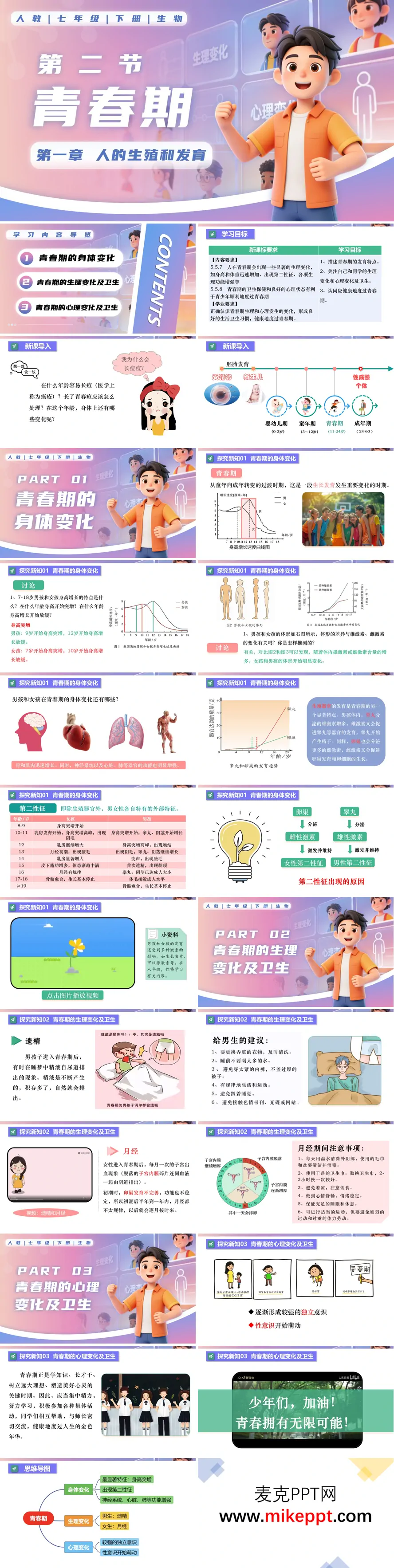 人教版七年级下册生物"青春期"课件,以"为什么脸上会冒痘痘"这一困扰青少年的常见现象为切入点,自然过渡到青春期身心剧变的科学解读。课程首先呈现身体形态的量化变化:通过男女生身高增长速率曲线对比,揭示女孩约9-11岁、男孩约11-13岁启动身高突增的性别时差,阐释雄性激素与雌性激素调控下骨盆增宽、肩部变宽等体形分化,以及脑皮层沟回加深、心肌增厚、肺活量增大等器官功能升级的发育规律,重点解析睾丸与卵巢成熟、遗精与月经初潮等生殖器官发育里程碑,及胡须生长、乳房发育、变声等第二性征显现的内分泌机制。在生理卫生指导环节,针对男性遗精现象建议保持外阴清洁、避免穿过紧内裤、建立规律作息,针对女性月经周期讲解子宫内膜周期性脱落的生理本质,强调经期保暖、适度休息、禁止剧烈运动的自我照护要点。心理发展板块则剖析独立意识觉醒带来的亲子张力、性意识萌动引发的人际敏感,提出以学业发展为优先目标、通过文体活动合理宣泄情绪、主动寻求师长同伴支持的心理调适策略。课程以青春期发育时间轴整合知识脉络,配套自我评估型随堂检测,帮助学生建立"变化是正常发育过程"的科学认知,培养主动获取健康信息、积极应对身心挑战的素养,平稳度过这一人生关键转折期。