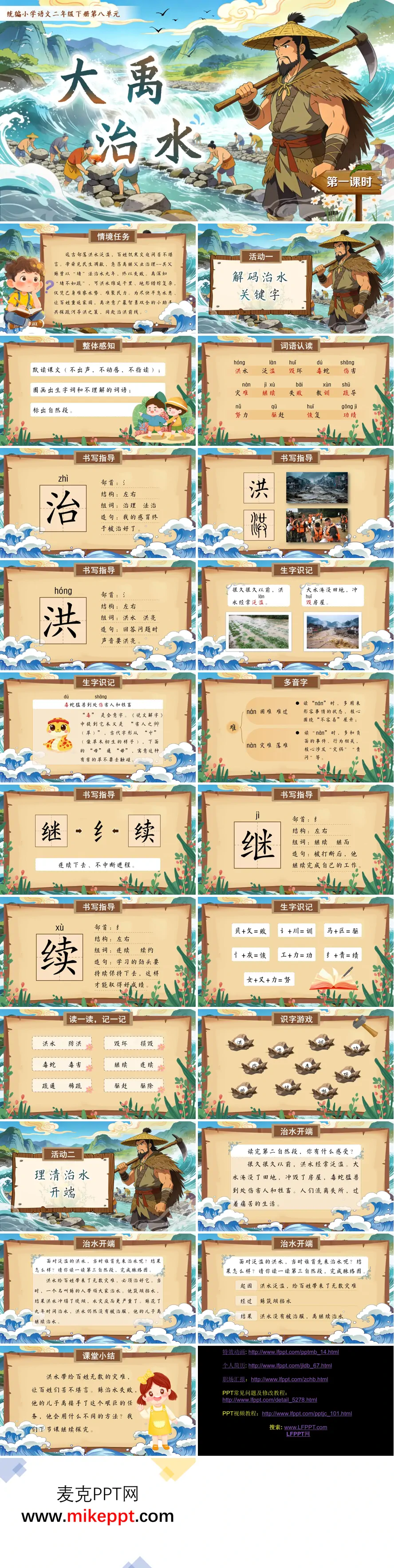 这是一套专为小学语文二年级下册《大禹治水》第一课时精心设计的教学课件,整体采用新颖独特的卡通国潮风格,以波澜壮阔的大禹治水场景为背景,搭配徐徐展开的古典卷轴、奔腾不息的滔滔波浪等传统元素,营造出既古朴典雅又生动活泼的课堂氛围,完美契合低年级学生的审美偏好与认知特点。 课件以"情境任务"巧妙开篇,通过讲述远古时期洪水泛滥、淹没村庄、伤害百姓的悲惨背景故事,配合洪水肆虐的震撼画面,迅速将学生带入特定的历史情境,激发他们了解治水英雄、探究治水方法的强烈学习兴趣,自然引出课题。 随后通过两大活动有序推进教学。活动一"解码治水关键字"系统落实识字教学目标。在整体感知环节,明确默读要求:圈画生字新词、标出自然段序号、思考课文主要讲了一件什么事,培养学生良好的阅读习惯。词语认读环节列出"洪、毒、蛇、兽、伤、灾、难、仍、退、继、续、认、训、被、恢"等生字,标注规范拼音,并通过洪水滔天、毒蛇猛兽、伤痕累累等图片辅助理解词义,建立字形与事物的直观联系。生字教学环节重点讲解"治、洪、毒、难、灾"等字的部首归属(如"洪"的三点水旁与水流相关)、间架结构、组词拓展(如"治理、洪水、毒蛇、灾难")和造句运用,同时灵活运用"贝+欠=败"等会意字拆分法揭示字理,进行"难(nán/nàn)"的多音字辨析,帮助学生高效识字、理解字义。最后设计"石头砸字"互动游戏,学生正确认读生字即可用石头砸破阻挡洪水的堤坝,在趣味挑战中巩固生字记忆。 活动二"理清治水开端"引导学生深入文本、把握脉络。教师组织学生阅读课文第二、三自然段,通过"淹没田地、冲毁房屋、伤害百姓"等关键词句,感受洪水给古代百姓带来的深重灾难;借助"鲧用筑坝挡水的办法,花了九年时间,仍然没有把洪水治好"的叙述,梳理鲧治水的起因(洪水泛滥)、经过(筑坝挡水九年)、结果(失败被处死),为下节课学习大禹"疏导"治水的智慧方法做好内容铺垫与认知对比。 课堂小结部分,教师以"鲧的筑坝挡水没有成功,他的儿子禹会用什么不同的方法来治理洪水呢?他能成功吗?"这一富有悬念的提问引发学生深度思考,激发持续阅读的兴趣,自然过渡到下一课时的学习。整套课件注重生字教学的趣味性与实效性,通过字理识字、游戏巩固、语境运用等多元策略夯实基础;同时注重故事脉络的清晰呈现,借助时间线索与因果逻辑帮助学生整体感知,完全符合低年级学生"形象思维为主、注意力持续时间短"的认知特点,体现了历史故事教学"语言训练与情感熏陶并重"的设计理念。