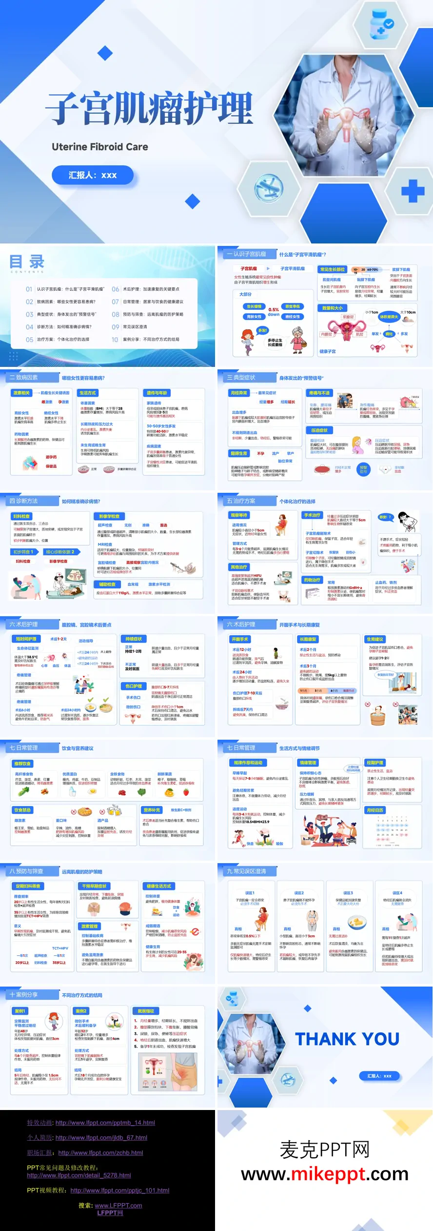 这套PPT是关于子宫肌瘤护理的健康教育课件,PPT介绍了子宫肌瘤的基本知识:它是女性生殖系统最常见的良性肿瘤,由子宫平滑肌组织增生形成,分为肌壁间、黏膜下和浆膜下三种类型,恶变率仅0.5%。致病因素包括激素水平、遗传、肥胖、长期熬夜及未生育等。典型症状涵盖月经异常(最常见)、下腹坠痛、压迫症状(尿频、便秘)及不孕等。 诊断方法包括妇科检查、超声(首选)、MRI及宫腔镜检查。治疗方案强调个体化:无症状者可观察等待;药物治疗适用于术前缩小肌瘤或缓解症状;手术治疗包括肌瘤剔除术(保留生育功能)和子宫切除术;还有HIFU等微创选择。 术后护理部分详细区分了腹腔镜/宫腔镜与开腹手术的不同护理要点,涵盖生命体征监测、饮食过渡、伤口护理及复查时间节点(术后1、3、6个月)。日常管理强调高纤维、优质蛋白饮食,避免雌激素含量高的食物;同时注重规律作息、适度运动及情绪调节。 预防与筛查建议20岁以上女性每年进行妇科检查+超声,35岁以上增加宫颈癌筛查。最后澄清了常见误区:肌瘤恶变率低、并非必须手术,绝经后仍需定期复查,并分享了定期监测和微创手术的成功案例,传递了科学、积极的疾病管理态度。