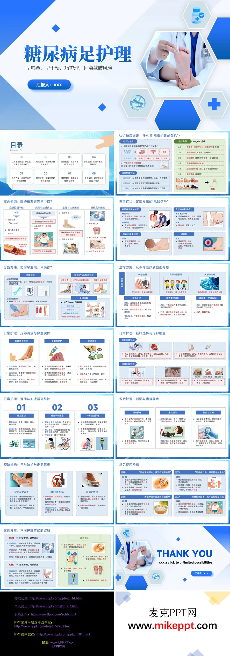 这套PPT主题为《糖尿病足护理——早筛查、早干预、巧护理,远离截肢风险》,系统讲解了糖尿病足的防治知识。PPT首先介绍了糖尿病足的定义与本质,指出其是由糖尿病引发的下肢血管病变、神经病变和感染所导致的严重并发症,并详细展示了Wagner分级标准(0-5级),从高危足到全足坏疽逐层递进。 内容涵盖八大板块:高危诱因(血糖控制不佳、病程长、足部畸形等)、典型症状(麻木、刺痛、溃疡、坏疽等危险信号)、诊断方法(感觉测试、血管检查、影像学检查)、治疗方案(从控糖、清创、抗感染到血管重建及截肢术)、日常护理(清洁保湿、鞋袜选择、运动指导)、术后护理、预防措施以及常见误区澄清。 PPT特别强调科学护理的重要性,通过正反案例对比——科学护理可避免截肢,忽视护理则可能导致严重后果——警示患者重视足部日常管理。最后明确了就医指征,提醒患者出现麻木、溃疡、坏疽等症状时应及时就诊。整套内容图文并茂,兼具专业性与实用性,适合糖尿病患者及家属学习参考。