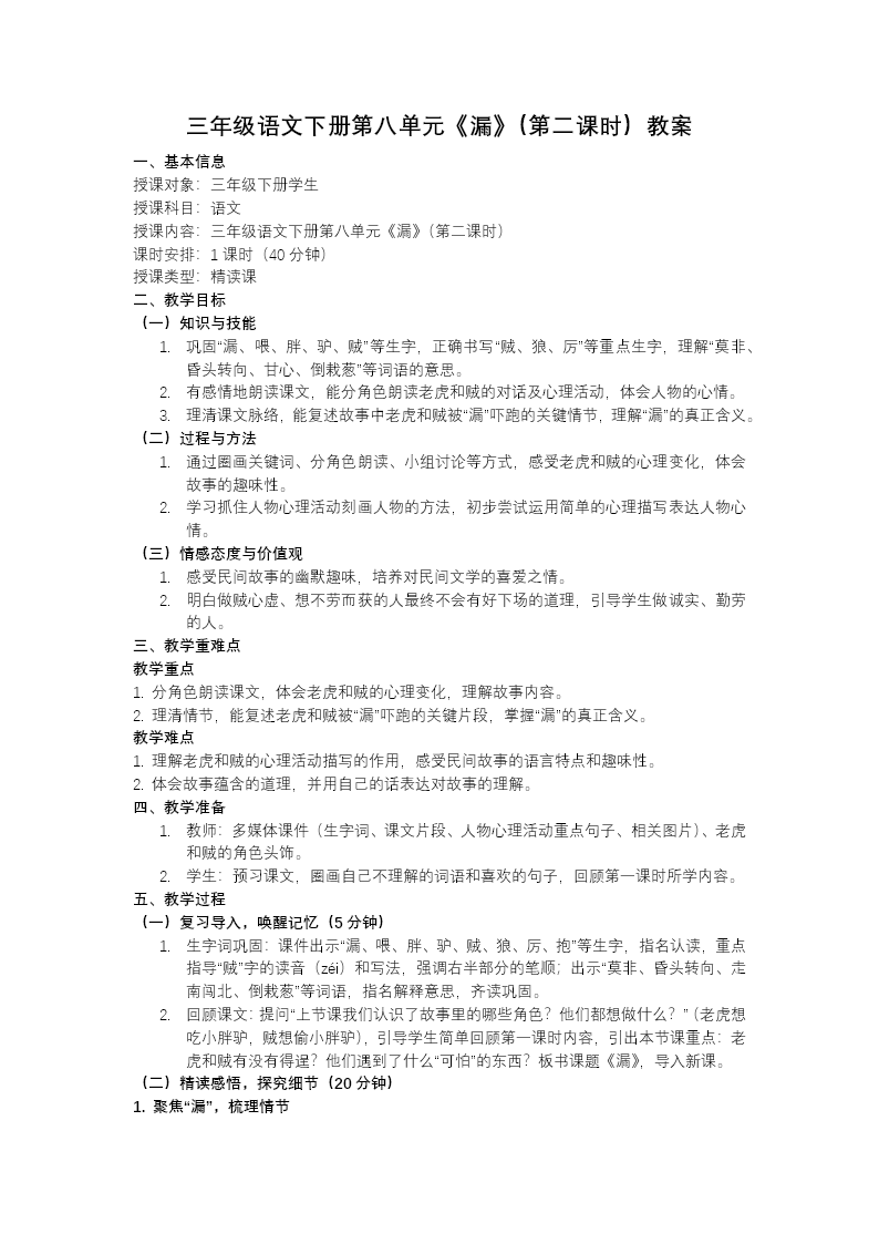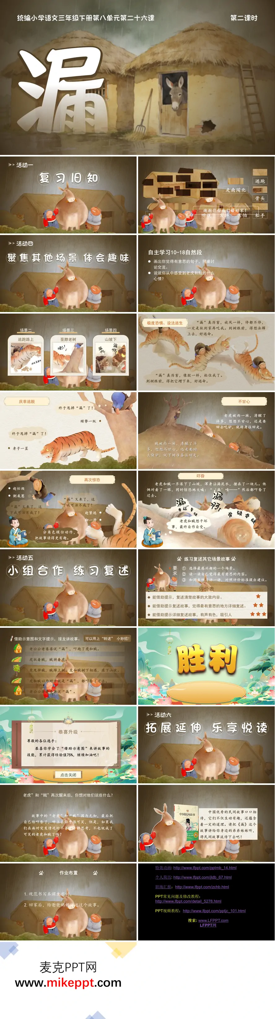 这是一套专为统编小学语文三年级下册《漏》第二课时精心设计的教学课件,延续了"复述技能提升练习场"的趣味情境主线,聚焦"借助示意图完整复述故事"的核心教学目标,以老虎和贼的心理变化为清晰线索,设计了层层递进、环环相扣的教学活动,引导学生在品读探究中掌握复述技巧,提升表达能力。 课件以"复习旧知"巧妙开篇,通过快速抢答回顾上节课梳理的人物关系——老虎想吃小胖驴、贼想偷小胖驴,以及"漏"这一贯穿全文的悬念设置,迅速唤醒记忆、衔接新课,为深入研读老虎和贼的逃跑经历做好铺垫。 第二环节"聚焦其他场景,体会趣味"将教学推向深入。教师引导学生聚焦"逃跑路上""歪脖老树""山坡下"等关键场景,通过圈画描写老虎和贼心理活动的语句,梳理出两人从"极度恐惧——以为'漏'在追自己",到"庆幸逃脱——滚下山坡甩掉了'漏'",再到"再次惊恐——互相以为对方是'漏'",最终"吓昏过去——双双昏倒在地"的完整心理变化轨迹。在对比品读中,学生深刻体会故事的幽默荒诞与民间智慧的巧妙。同时开展分角色朗读指导,鼓励学生加入"腿脚发软""浑身发抖"等动作模仿,以及"惊恐瞪眼""气喘吁吁"等神态表现,让故事讲述更加生动形象。 第三环节"小组合作,练习复述"落实核心目标。课件提供清晰的示意图支架——以地点转换为横轴(老婆婆家→逃跑路上→歪脖老树→山坡下→老婆婆家),以心理变化为纵轴,帮助学生建立复述线索。传授"转述"小妙招:将直接引语改为间接引语、适当省略重复情节、保留关键动作与心理,引导学生按地点顺序合作练习复述。配套星级评价表进行分层激励:"能复述大致内容"获三星,"能详细复述情节"获四星,"能有声有色、加入动作表情复述"获五星,让学生在明确标准中逐步提升表达能力。 第四环节"拓展延伸,乐享悦读"实现思维深化与阅读延伸。设置思辨讨论:"如果我是老虎和贼,醒来后发现了真相,会说什么?会想什么?"鼓励学生创意表达、各抒己见。推荐《中国民间故事》拓展阅读,感受更多民间智慧的幽默与魅力。布置实践作业:将《漏》的故事生动讲给家人听,请家人担任听众并打出星级,实现课堂学习向家庭生活的有效迁移。 整份课件将文本理解、口语表达与思维思辨有机融合,用示意图可视化降低复述难度,用趣味情境激发学习兴趣,用星级评价激励持续进步,让学生在欢声笑语中掌握有序、生动复述故事的表达技巧,切实提升语文核心素养。