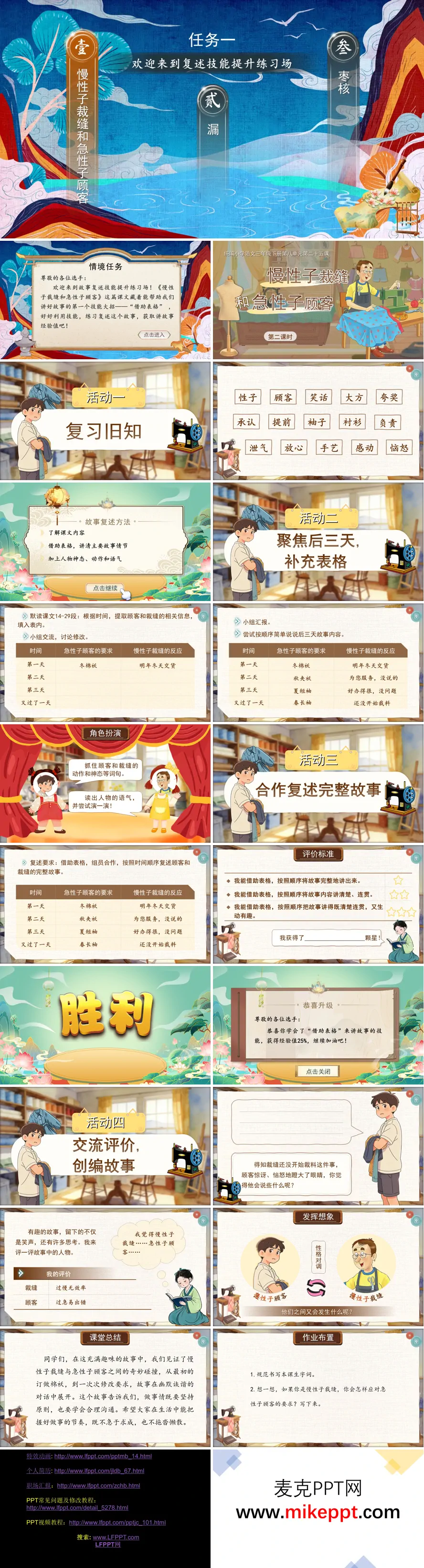 这是一份专为统编小学语文三年级下册《慢性子裁缝和急性子顾客》第二课时精心打造的教学演示文稿,它巧妙延续了第一课时所创设的"复述技能提升练习场"这一沉浸式教学情境,以技能进阶为主线,系统推进学生复述能力的螺旋式上升。整份课件紧扣"借助表格复述完整故事"这一核心教学目标,精心设计四大递进式学习活动,引导学生在结构化支架的支持下,逐步实现从部分到整体、从简单到复杂的复述跨越。 课件以"活动一:温故知新"开启学习之旅,通过系统复习第一课时的核心字词,帮助学生唤醒知识记忆;同时回顾"借助表格梳理信息+适当添加神态动作"的复述方法,建立新旧知识之间的有机衔接,为后续深入学习奠定坚实基础。 "活动二:信息提取与表格完善"是课文的精读环节。教师引导学生聚焦故事后三天的情节发展,采用默读批注的方式自主提取关键信息;继而组织小组合作汇报,共同补充表格中关于顾客三次修改制作要求以及慢性子裁缝相应回应的具体内容。这一环节不仅完善了故事发展的完整脉络,更培养了学生精准捕捉文本信息的能力,使表格真正成为把握叙事结构的思维工具。 进入"活动三:合作复述与星级评价",课件将教学推向实践应用的高潮。学生依托已完善的表格支架,开展同伴合作复述练习;配合生动的角色扮演活动,让学生在情境模拟中内化故事内容。特别设计的星级评价标准从完整性、条理性、生动性等维度给予学生明确指引,使复述练习有标可依、有阶可攀,切实掌握有序且生动的复述技巧。 "活动四:思辨深化与创意拓展"则体现语文教学的育人价值。教师组织学生围绕两位主人公展开多元评价,在观点碰撞中理解人物性格的多面性;继而设置"性格对调"的创意写作任务,引导学生想象倘若裁缝变得急性子、顾客变成慢性子,故事将如何改写。这一设计有效培养学生的批判性思维与创造性想象力,实现语言运用与思维发展的同频共振。 课件结尾的课堂总结画龙点睛,引导学生领悟故事背后"把握做事节奏、理解不同个性"的深刻寓意;作业布置兼顾基础与拓展,既有字词巩固的常规练习,也有创意表达的弹性任务。整体设计环环相扣、层层递进,既扎实落实了借助表格复述故事的语文要素,又全面促进了学生语言建构、思维发展、审美鉴赏等语文核心素养的综合提升。