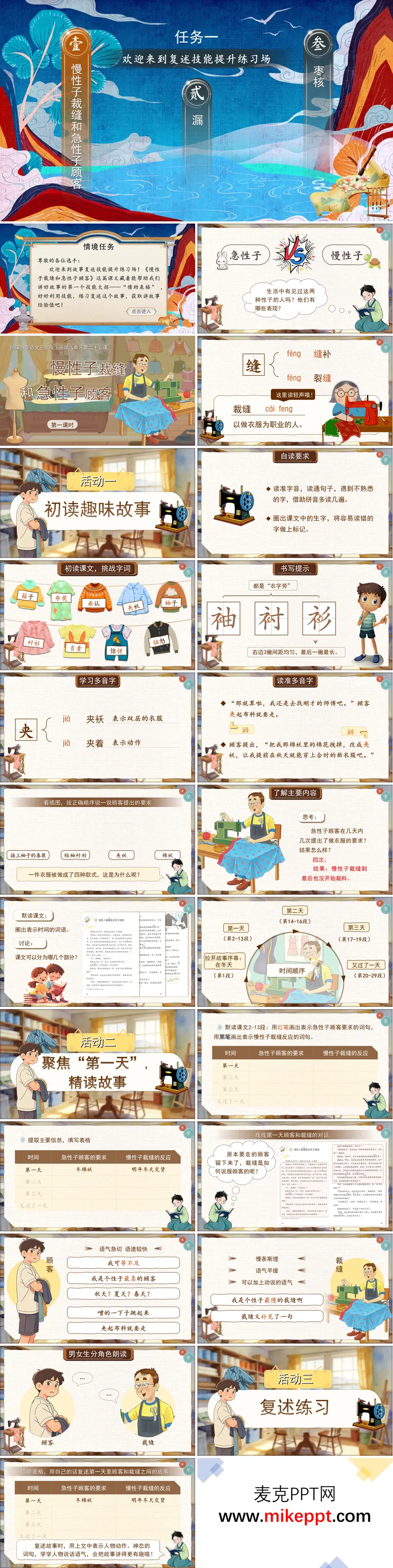 这是一份为统编小学语文三年级下册《慢性子裁缝和急性子顾客》第一课时量身定制的教学演示文稿,其整体设计采用了温馨治愈的中国风与卡通风格相融合的视觉语言,色彩柔和、形象生动,高度契合小学低年级学生的认知特点与审美偏好。整份课件以"复述技能提升练习场"作为贯穿始终的情境主线,巧妙创设沉浸式的学习氛围,将课堂学习划分为四个紧密关联的核心活动板块,引导学生在趣味盎然的语文实践中开启复述能力培养的启蒙之旅。 课件首设"初读趣味故事"环节,以"挑战字词"的闯关形式激活学习热情。该环节精准聚焦本课的语言难点:针对"缝、夹"等多音字,通过语境辨析帮助学生掌握不同读音的用法规律;对于"袖、衬、衫"等带有"衣字旁"的生字家族,则采用字理识字与书写指导相结合的方式,引导学生在观察字形结构、理解字义关联的过程中,扎实掌握读音要领与书写规范,为深入阅读扫清字词障碍。 进入"聚焦'第一天',精读故事"环节,课件引导学生细致梳理急性子顾客在一天之内接连提出的四次改做衣服要求——从棉袄到夹袄,再到短袖衬衫,最后竟想改成春装;同时对比呈现慢性子裁缝面对这些催促始终"没开始裁料"的淡定反应。通过结构化表格的呈现与入情入境的分角色朗读,学生在鲜明的语言对比中深刻体会两人一急一缓、一动一静的极端性格反差,感受童话故事夸张幽默的艺术魅力。 "复述练习"环节是课件的能力转化关键。教师借助清晰的时间线索和已填写的信息表格,搭建起复述的语言支架,鼓励学生尝试用自己的话讲述第一天发生的故事片段。这一设计引导学生初步学习如何抓住关键信息、按照时间顺序组织语言,为后续完整复述长篇故事积累方法经验。 最后的"书写指导"环节,课件对"性、顾、卷"等字形复杂、易写错的生字进行重点点拨,通过笔顺动画、结构分析和书写要诀提示,帮助学生夯实写字基础,培养良好的书写习惯。 整份课件将识字写字、朗读感悟、文本理解与口语表达有机融合,既扎实落实了字词教学的基础目标,又通过生动的情境创设和多元的互动设计,充分激发学生的学习兴趣与表达欲望,为第一课时后续乃至第二课时的完整复述训练做好了扎实的铺垫。