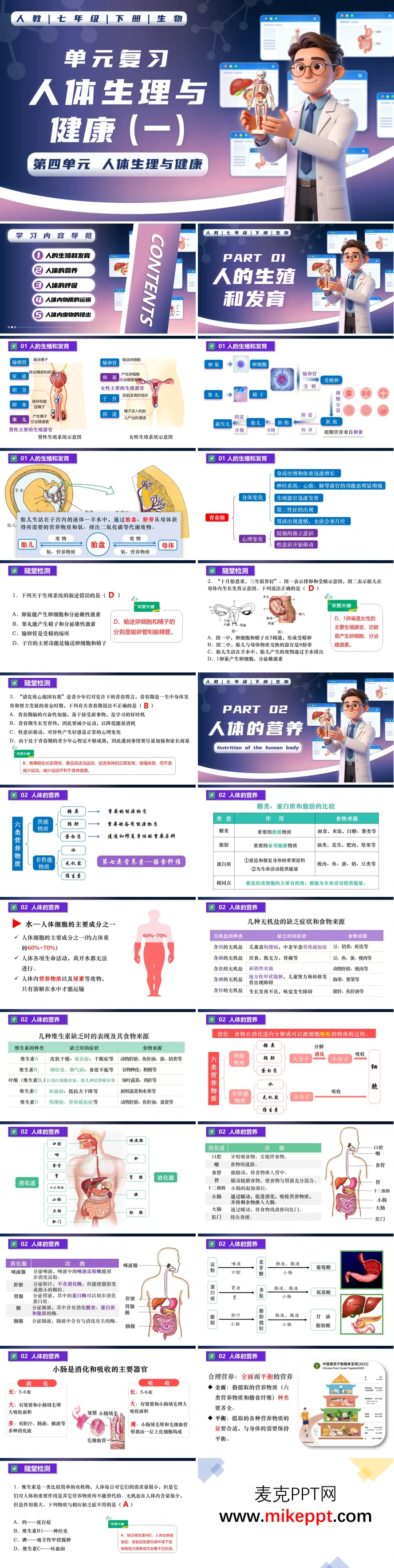 本复习课件针对人教版七年级下册生物第四单元"人体生理与健康(一)"进行系统性知识整合。内容架构涵盖五大核心模块:首先梳理人的生殖与发育,详解男女生殖系统解剖结构及功能差异,阐释胚胎发育历程与青春期身心特征演变;其次聚焦人体营养,归纳六大营养素生理功能与膳食来源,剖析消化系统器官协作机制,突出小肠在消化吸收中的核心地位;第三模块解析呼吸生理,从呼吸道结构到呼吸运动 mechanics,再到肺泡-血液界面的气体交换原理层层递进;第四部分围绕物质运输,整合血液组分、血管分类及心脏四腔结构,图解体循环与肺循环的双路径协同;最后回归排泄系统,阐明泌尿器官分工、尿液生成的滤过-重吸收机制及多元排泄途径。整套资源依托可视化图表、对比表格及阶梯式课堂检测,引导学生建立横向关联、纵向贯通的人体生理知识网络,深化对生命活动整体性的理解。