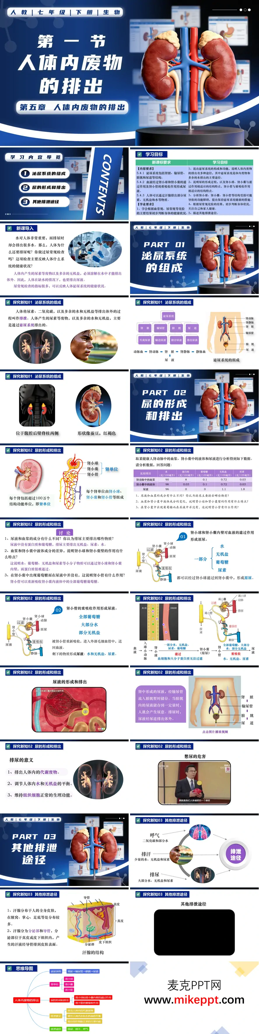 本课件围绕人教版七年级下册"人体内废物的排出"章节展开教学设计。课堂导入环节以"为何人体缺水时仍需排尿"及"尿常规化验单能揭示哪些健康信息"等生活化问题切入,引导学生理解排泄的本质——机体将代谢产生的尿素、二氧化碳以及多余水分与无机盐排出体外的生理过程。随后系统阐述泌尿系统的解剖构成,重点剖析肾脏作为尿液生成核心器官的结构特点,强调每个肾脏由逾百万个肾单位构成,后者是实现泌尿功能的基本结构单元。在尿生成机制的教学中,课件借助数据对比与动态示意图,分层解析肾小球与肾小囊内壁的滤过作用形成原尿,以及肾小管选择性重吸收最终形成尿液的生理过程,并阐明排尿活动在清除代谢废物、调控水盐平衡及保障细胞稳态中的多重功能。此外,内容还涵盖呼吸系统气体交换与皮肤汗腺分泌等辅助排泄途径,辅以结构化思维导图与即时课堂检测,助力学生构建完整的排泄知识体系,深入把握人体代谢废物排出的调控机理。