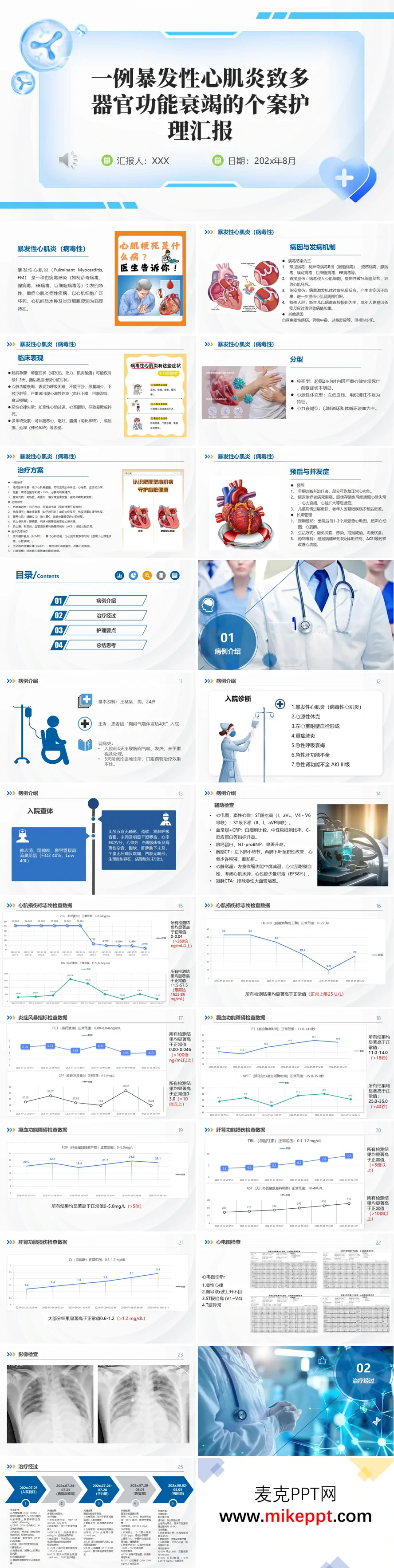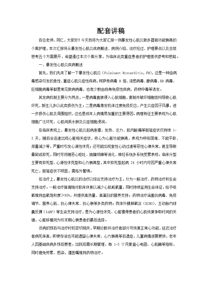 这是一份关于一例暴发性心肌炎(病毒性)导致多器官功能衰竭的个案护理汇报。其主要内容涵盖了从疾病概述、病例介绍、详细治疗经过到具体护理要点和最终思考总结的全过程。 核心内容概述如下: 疾病概述:PPT开篇对暴发性心肌炎进行了专业介绍,包括其定义、常见致病病毒、发病机制、临床表现、分型、治疗方案及预后,为理解后续个案奠定了基础。 病例详情:汇报以一例24岁男性患者(王某某)的完整病例为核心。患者因“胸闷气喘伴发热4天”入院,迅速进展为暴发性心肌炎并发心源性休克、急性呼吸衰竭、急性肝肾功能不全等多器官功能衰竭。PPT以图文形式展示了患者的关键检查结果,包括显著异常的心肌损伤标志物(如肌钙蛋白I)、炎症指标、凝血功能和肝肾功能数据,以及心电图、心脏彩超等重要影像学发现。 诊疗与护理过程:这是PPT的重点,通过时间轴和详细的表格,系统梳理了患者从入院到出院的完整治疗与护理经过。治疗方面,涵盖了生命支持(如机械通气、血管活性药物、连续性肾脏替代治疗CRRT)、抗感染、抗病毒、免疫调节、抗凝、器官功能保护等多维度综合干预。护理方面,则专门分为循环支持、呼吸支持、抗感染、心肌保护四大核心模块,详细阐述了每个环节的监测要点、操作规范、药物管理和并发症预防措施,体现了重症护理的系统性和精细化。 总结与思考:汇报最后总结了救治此类危重病例的体会,强调了重症医学的复杂性、个体化精准治疗的重要性、多器官功能支持的协同作用,以及医患沟通与人文关怀的不可或缺性。
