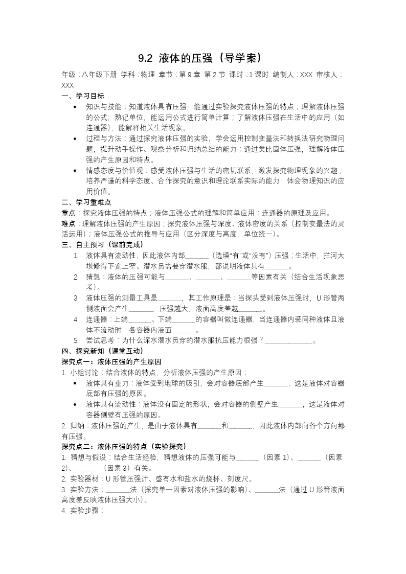 本课件聚焦人教版八年级下册物理第九章"压强"第二节"液体的压强",采用探究式教学展开。课程伊始,通过对比方形铁块与水对容器底部产生的不同作用效果,引发学生对液体压强特性的认知需求。借助橡皮膜形变实验与U形管压强计定量测量,引导学生运用控制变量法进行系统探究,逐步建构液体压强的核心规律:液体内部向各个方向均存在压强,同一深度处各方向压强大小相等;压强随深度增加而线性增大;在相同深度条件下,液体密度越大则压强越大。基于此实验结论,课件推导并讲解液体压强的计算公式及其适用情境。随后引入连通器原理,阐明上端开口、下端连通的容器系统在静止状态下液面保持相平的物理机制,并结合茶壶、锅炉水位计、三峡船闸等典型实例,揭示该原理在工程技术与日常生活中的广泛应用。课程最后通过知识网络梳理、分层练习及综合应用训练,指导学生运用液体压强理论阐释潜水服抗压设计、水坝上窄下宽结构等实际问题,实现物理观念的深度迁移。