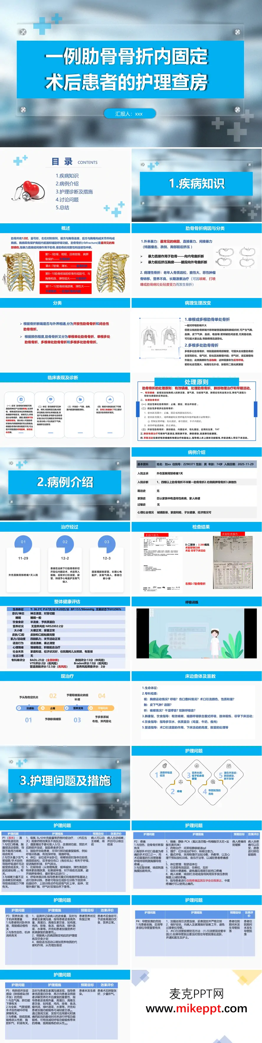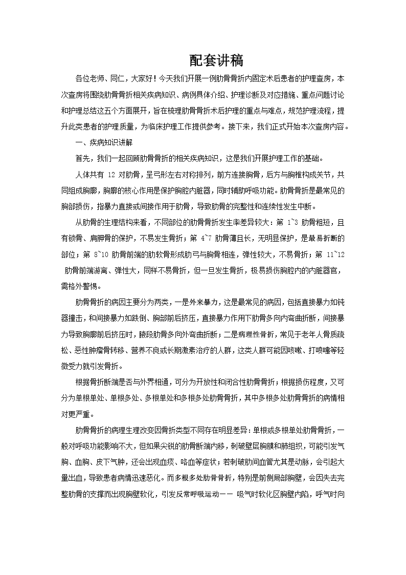 这是一套关于肋骨骨折内固定术后患者护理查房的医学PPT,共33页,内容系统全面,结构清晰。 PPT首先介绍了肋骨骨折的疾病知识,包括解剖特点(第4-7肋骨最易骨折)、病因分类(外来暴力与病理性骨折)、病理生理改变及临床表现。重点阐述了多根多处肋骨骨折导致的"连枷胸"和反常呼吸运动等严重并发症。 病例部分展示了一位74岁男性患者的完整诊疗经过:因外伤致左侧第2-7肋骨骨折、右肩胛骨骨折及肺挫伤入院,行肋骨骨折切开复位内固定术,术后留置前胸后背引流管。 护理部分是核心内容,提出五大护理问题:清理呼吸道低效、疼痛、营养失调、导管脱落危险及潜在并发症(肺部感染/肺不张)。针对每个问题制定了详细的护理措施,包括静脉镇痛、雾化吸入、呼吸功能训练(缩唇呼吸、腹式呼吸)、体位管理、营养支持及引流管护理等,并附有预期目标和效果评价。 最后通过思维导图总结肋骨骨折护理要点,并讨论了老年患者呼吸道管理的重点,强调防跌倒宣教的重要性。