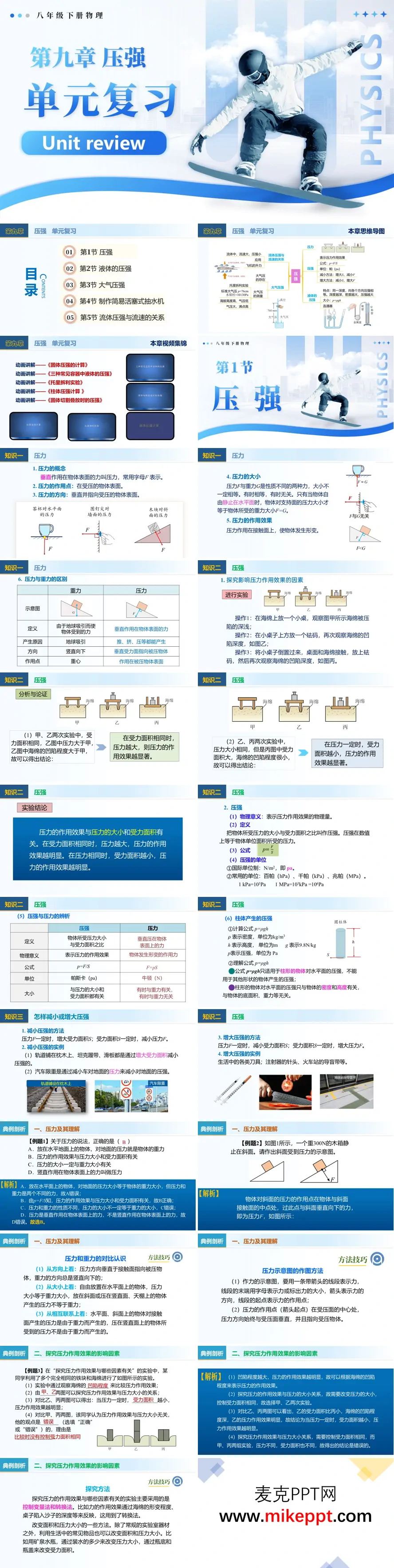 本复习课件系统整合人教版八年级下册物理第九章"压强"全章内容,以结构化思维导图为统领展开模块化梳理。首环节聚焦固体压强,重温压力的三要素特征,通过对比实验回顾压力作用效果的双重影响因素,深化压强概念的物理内涵与单位规范,并归纳改变压强的工程策略——增大压力或减小受力面积以增压,反之则减压,辅以典型例题辨析压力与压强的概念差异及计算要点。第二模块转向液体压强,再现液体内部向各方向存在压强、同一深度处各向等压、压强随深度与密度递增的实验规律,同时重温连通器"上端开口、下端连通、静液面保持相平"的原理及其在茶壶、船闸中的技术应用。第三环节回顾大气压强,从马德堡半球实验到托里拆利测量,梳理大气压的存在证据、数值测定方法、海拔与气象变化规律,以及活塞式抽水机的工作原理。末模块回归流体动力学,重申流速大的位置压强小这一核心规律,结合机翼升力产生机制、火车站台安全线设置等实例阐释现象本质。整套资源依托知识网络建构、变式例题精讲及方法技巧提炼,助力学生形成压强问题的系统分析框架,提升综合应用与迁移创新能力。