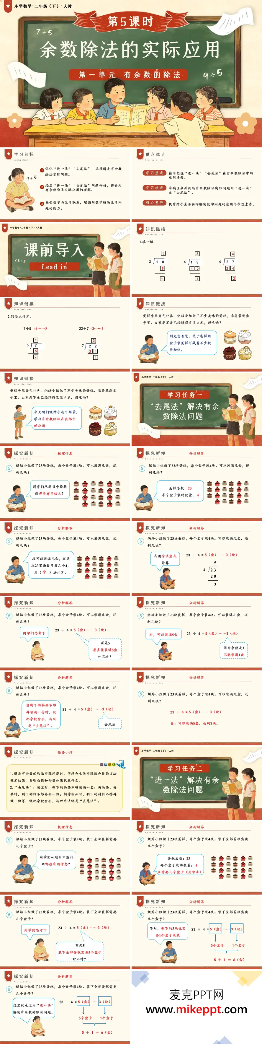 这是一份人教版小学数学二年级下册"有余数的除法"第五课时的教学课件,聚焦于"有余数除法的实际应用"。课件开篇清晰呈现学习目标、教学重难点及核心素养培养方向,继而通过复习除法竖式计算唤醒学生已有知识经验,为后续学习奠定基础。随后,教师创设"蛋糕房装蛋糕"的生动生活情境,自然引出实际问题,激发学生探究欲望。在学习任务一中,以"23块蛋糕,每4块装一盒,能装满几盒"为具体案例,引导学生运用除法竖式计算得出23÷4=5……3,通过分析剩余的3块蛋糕不足以再装满一盒的实际情况,帮助学生理解"去尾法"的应用,即根据实际情况直接舍去余数。在学习任务二中,变换问题为"装下全部蛋糕需要几个盒子",促使学生思考剩余的3块蛋糕同样需要盒子来装,从而领悟"进一法"的精髓,即在商的基础上加1以满足实际需求。随后,课件引导学生回顾反思,运用"除数×商+余数=被除数"的关系式验证计算结果的准确性,强化知识内化。课堂练习和达标练习环节设计了分面包、买面包、装矿泉水等丰富多样的生活化题目,引导学生在不同情境中灵活选择"去尾法"或"进一法",培养具体问题具体分析的能力。最后进行知识总结,并布置绘制思维导图、完成课后作业等拓展任务,整个教学设计紧密联系生活实际,循序渐进地提升学生运用数学知识解决实际问题的能力。
