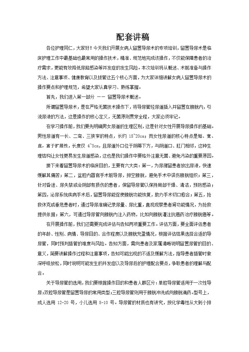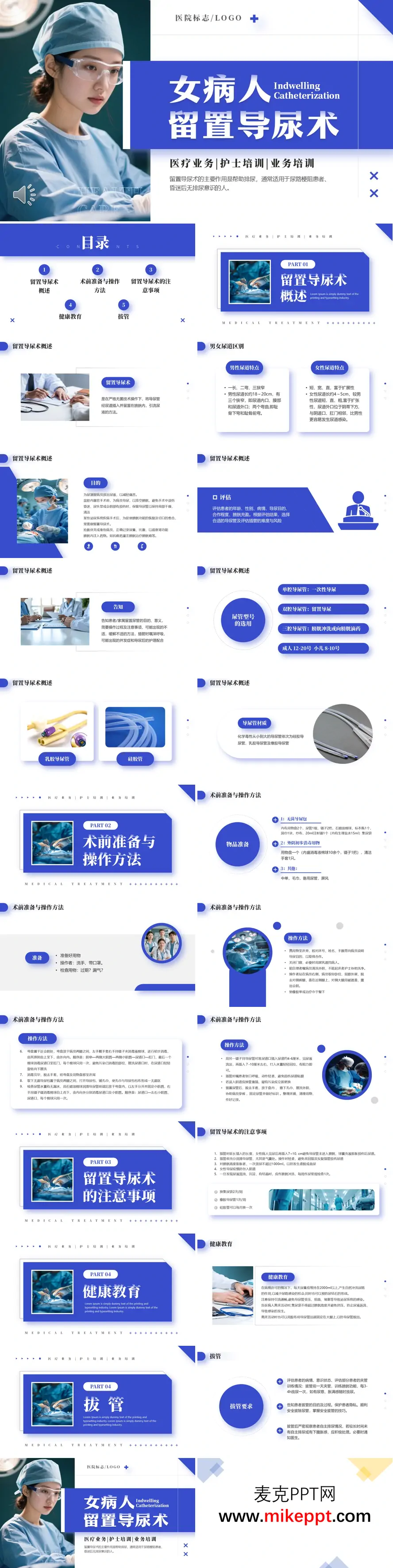 女病人留置导尿术PPT介绍 这是一套关于女病人留置导尿术的专业医学培训PPT,采用蓝白色调的简洁医疗风格设计,共24页。内容系统全面,分为五大模块:留置导尿术概述、术前准备与操作方法、注意事项、健康教育及拔管。 PPT首先介绍了留置导尿术的定义——在严格无菌操作下将导尿管经尿道插入膀胱引流尿液的技术,对比了男女尿道解剖差异(女性尿道短、宽、直,约4-5cm),并列举了适应症:尿潴留、术前准备、昏迷护理、休克监测及膀胱灌注治疗等。 在操作环节,详细讲解了物品准备(无菌导尿包、消毒液、集尿袋等)、环境准备及具体步骤:从外阴初步消毒(由外向内)到铺巾后的再次消毒(由内向外),再到插管4-6cm见尿后再插入7-10cm、打水囊固定等关键流程。 PPT还强调了注意事项:膀胱高度膨胀者首次放尿不超过1000ml,防止虚脱;严格无菌操作避免误入阴道;定期更换尿管(硅胶管可每月更换)及集尿袋。健康教育部分指导患者每日饮水2000ml以上,保持引流通畅,避免尿液反流。最后介绍了拔管前需夹管训练膀胱功能,拔管后观察自主排尿情况。