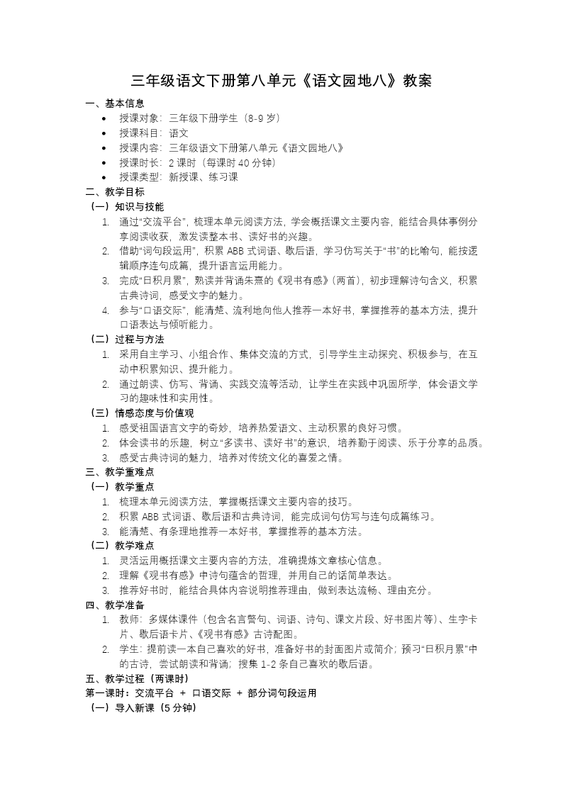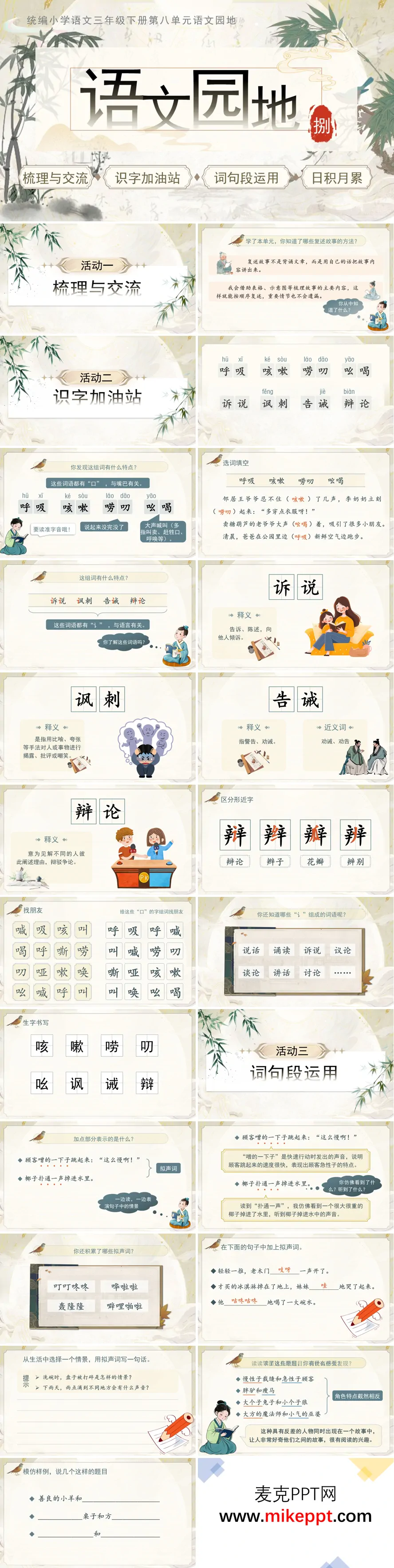 这是一份小学语文三年级下册第八单元《语文园地八》精心设计的综合性教学演示文稿,其整体设计呈现出清新雅致的视觉风格,以"梳理与交流、识字加油站、词句段运用、日积月累"四大经典板块为骨架,巧妙串联起内容丰富、层次分明的学习活动,引导学生在系统复习中巩固知识,在综合实践中提升素养。 课件首设"梳理与交流"环节,充分发挥单元总结的功能价值。教师引导学生回顾本单元所学的复述方法,特别强调复述的本质在于"用自己的话重新讲述"而非机械背诵原文,帮助学生建立正确的复述观念;同时梳理借助表格、示意图等可视化工具梳理故事脉络的具体策略,让学生在交流分享中深化认识,掌握使复述更加条理清晰、重点突出的实用技巧。 "识字加油站"环节聚焦汉字偏旁表意的构字规律,选取"口"字旁与"讠"字旁两大部首展开集中教学。通过与嘴巴动作相关的"呼吸、咳嗽、唠叨"等词语,以及与语言表达相关的"诉说、讽刺、辩论"等词汇,引导学生在对比观察中理解偏旁与字义之间的内在关联,感受汉字构形的智慧。与此同时,针对"辩、辫、瓣、辨"等学生易混淆的形近字进行专项辨析,通过字形溯源、组词比较、语境运用等方式,帮助学生夯实字词基础,提升准确运用汉字的能力。 "词句段运用"环节从三个维度展开精细化语言训练:拟声词板块通过"噌的一下""扑通一声"等鲜活范例,引导学生在朗读品味中感受拟声词增强表达生动性的独特效果;反差式故事题目板块以"慢性子裁缝和急性子顾客"等本单元典型标题为例,解析通过性格对比激发阅读兴趣的命题技巧,鼓励学生尝试创作;转述句板块则系统讲解直接引语转换为间接引语时人称代词、标点符号的变化规则,通过典型例句的改写练习,帮助学生掌握这一重要的句式转换能力。 最后的"日积月累"板块,精选"兵来将挡,水来土掩""不入虎穴,焉得虎子"等蕴含智慧的八字成语,引导学生在诵读积累中理解其深刻含义,并创设具体语境鼓励学生尝试运用,实现从积累到运用的能力跃升。课件还配套布置分层作业,既有基础性的抄背巩固,也有拓展性的搜集整理,满足不同学生的学习需求,实现知识的有效延伸。 整份课件四大板块各有侧重又相互关联,既注重基础知识的扎实训练,又强调语言运用能力的培养,同时渗透着中华优秀传统文化的传承,是一份设计精巧、内容丰实的单元复习教学资源。
