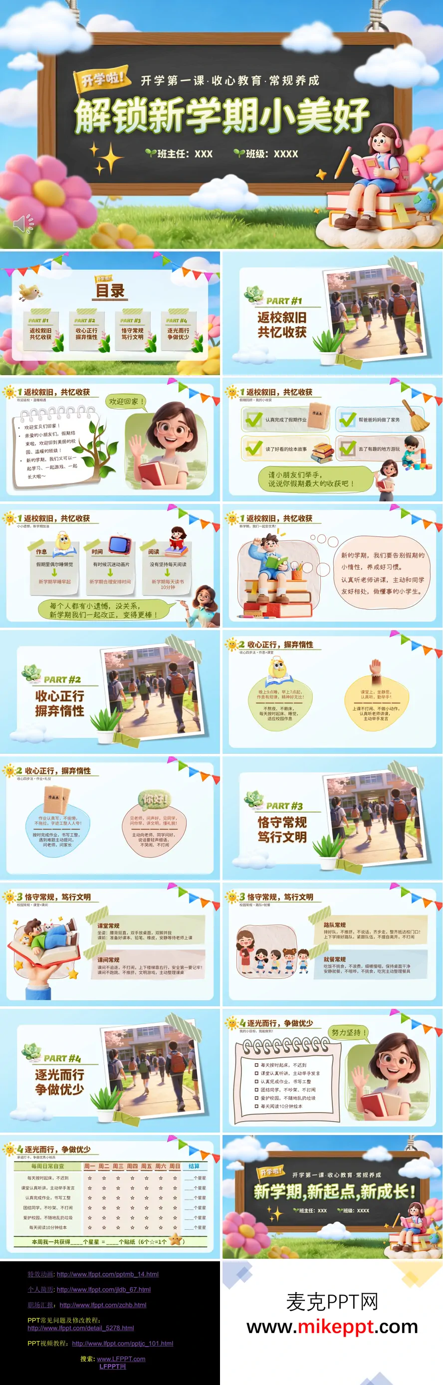 这套PPT是一套小学开学第一课主题班会课件,主题为"解锁新学期小美好",整体采用清新可爱的3D卡通风格,色彩明亮活泼。 课件共分为四个部分:第一部分"返校叙旧,共忆收获",通过欢迎语和假期回顾,引导学生分享假期作业、家务、阅读、游玩等收获,同时正视假期中的作息、时间管理、阅读等小遗憾,鼓励新学期改正;第二部分"收心正行,摒弃惰性",提出"收心四步法",从作息规律、课堂纪律、作业完成、文明礼仪四个方面帮助学生收心;第三部分"恪守常规,笃行文明",详细讲解课堂、课间、路队、就餐等校园日常行为规范;第四部分"逐光而行,争做优少",设立"我的小目标"清单,并配套每周日常自查打卡表,通过星星奖励机制激励学生坚持良好习惯。