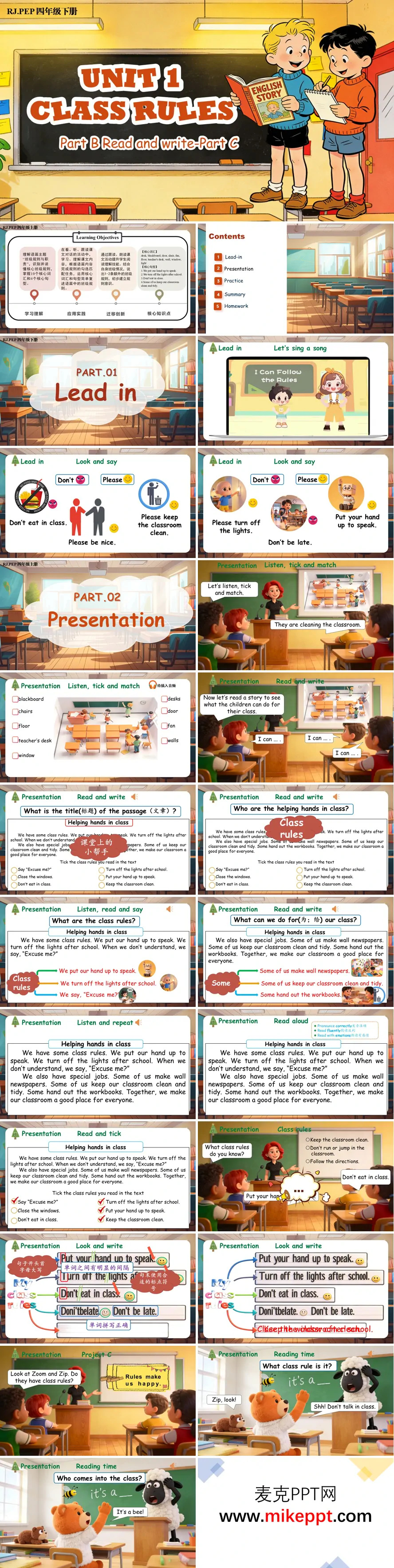 这是一份为人教版PEP四年级下册英语Unit 1《Class Rules》精心设计的教学演示文稿,聚焦Part B Read and write与Part C两大板块,其整体风格生动活泼、图文并茂,充分契合小学中年级学生的认知发展特点与英语学习规律。 整份课件以"课堂规则"为核心主题,结构清晰严谨,依次展开五个紧密衔接的教学环节。在Lead-in导入环节,教师巧妙运用歌曲《I Can Follow the Rules》营造轻松愉悦的课堂氛围,配合"Look and say"看图说话活动,引导学生运用"Don't..."和"Please..."的句式结构,如"Don't eat in class""Please keep the classroom clean"等,快速激活学生关于课堂规则的已有知识储备,自然引出本课学习主题。 进入Presentation新知呈现环节,课件设计层次分明的读写活动:通过"Listen, tick and match"听力任务培养学生信息获取能力,借助"Read and write"阅读活动引导学生深入研读短文《Helping hands in class》。学生在阅读过程中学习并系统梳理文中呈现的各项课堂规则,包括"Put your hand up to speak""Turn off the lights after school"等行为规范,同时了解学生们如何通过制作墙报、分发练习册等特殊任务来共同维护良好的课堂环境。此外,课件还融入Zoom和Zip的趣味故事,让学生在生动形象的情境中巩固运用所学规则语言,实现知识的情境化迁移。 Practice练习环节匠心独运,设计"Make a sign"创意任务,组织学生分组合作创作班级规则提示牌。这一活动将语言学习与美术创作、团队协作有机结合,让学生在实践中巩固核心句型,深化对规则内涵的理解,同时培养其动手实践能力与创造性思维。 Summary总结环节系统回顾本课时所学的核心课堂规则,以清晰的图表或思维导图形式帮助学生构建完整的知识框架,强化记忆效果。Homework作业布置体现因材施教理念,采用分层设计策略:基础层侧重听读模仿,确保语言输入的准确性;拓展层鼓励学生自主设计规则提示牌、收听英语故事等,兼顾知识巩固与能力创新,满足不同层次学生的发展需求。 综观整套课件,其突出特色在于图文并茂的视觉呈现与强互动性的活动设计,既注重语言知识的系统输入,又强调学生的实践运用与迁移创新,有效帮助学生在真实语境中理解课堂规则的意义,内化规则意识,提升英语综合语言运用能力,实现了工具性与人文性的双重教学目标。