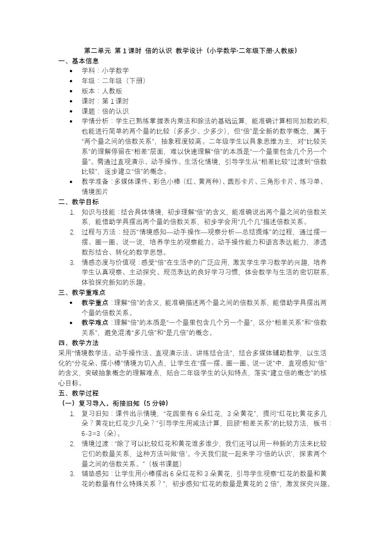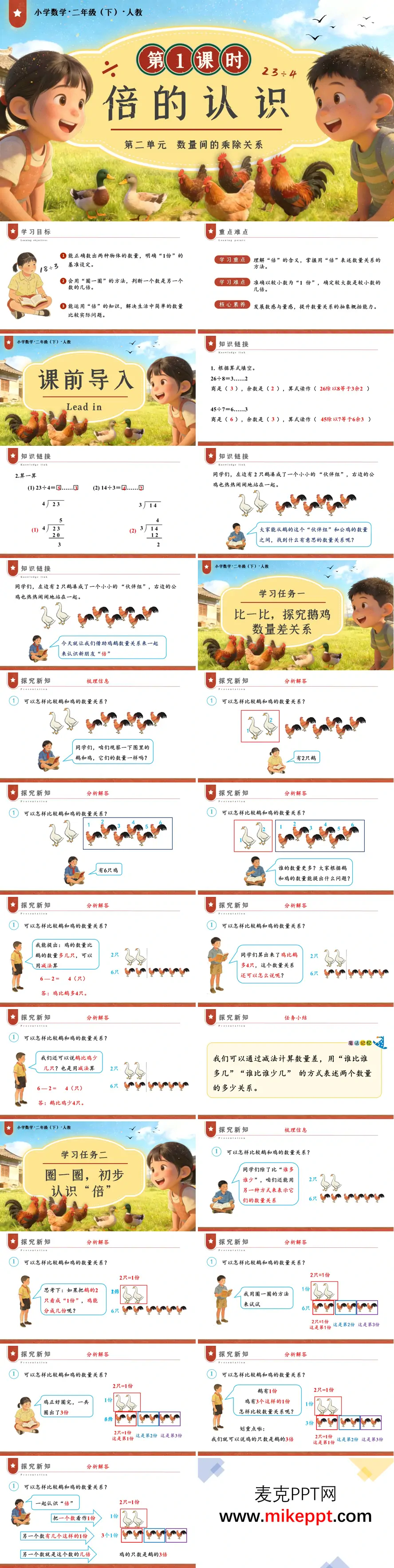 本节课以人教版三年级上册"倍的认识"为核心内容,围绕鹅与鸡的数量关系展开教学。课堂伊始,教师出示2只鹅和6只鸡的情境图,先引导学生运用已有知识通过减法比较"谁比谁多几",建立新旧知识的联结点。随后,教师巧妙设疑,自然引出"倍"这一全新的数量关系概念,组织学生开展"圈一圈"的数学活动——将2只鹅圈定为1份标准量,再把6只鸡按每2只一份进行圈画,使学生在直观操作中清晰观察到鸡恰好包含3个这样的份数,从而水到渠成地理解"鸡的只数是鹅的3倍"这一倍数关系。新知探究环节注重让学生经历"先确定1份数、再数有几个这样的一份"的思维过程,初步建构倍的分析模型。巩固练习阶段设计了达标检测、圈画练习、摆小棒操作等多样化活动,引导学生在不同情境中反复体验"以谁为标准""有几份就是几倍"的判断方法,逐步内化概念本质。课堂尾声通过思维导图梳理知识脉络,配合分层作业设计,兼顾不同学生的发展需求,帮助学生形成对"倍"这一抽象数量关系的完整认知结构,为后续学习"求一个数是另一个数的几倍"及"倍数应用题"奠定坚实基础。