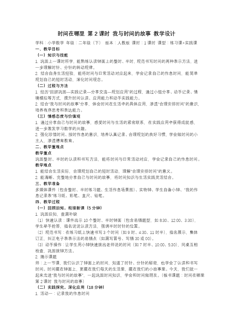 本节课以人教版二年级下册《我与时间的故事》,以"时间在哪里"为探究线索贯穿教学全程。课堂导入环节,教师以"如果生活中没有时间会怎样"这一富有冲击力的设问开启对话,引导学生在思辨中唤醒对时间的原有认知,进而通过运动、作息、出行、餐饮等多元生活场景的呈现,帮助学生深刻体会时间与日常生活的紧密联系,感受时间的无处不在。核心探究阶段聚焦"1分钟、1秒钟的价值"展开体验活动:借助脉搏跳动60次约1分钟、跳绳次数累加、蜂鸟心跳400次仅需1秒等生动实例,将抽象的时间单位转化为可感知的具体现象;再通过"数秒到1分钟""闭眼估算30秒"等沉浸式互动,让学生在身体参与中逐步建立准确的时间量感,理解分与秒的实际意义。巩固应用环节设计贴近儿童经验的生活情境练习,在趣味化、游戏化的任务中自然渗透珍惜时间的价值引领。整节课以儿童生活为锚点,通过具身认知与情感体验的深度融合,使抽象的时间概念变得可视、可触、可感,有效促进二年级学生时间观念的形成与发展。