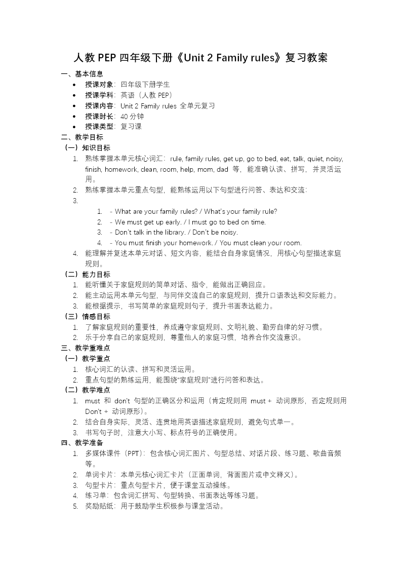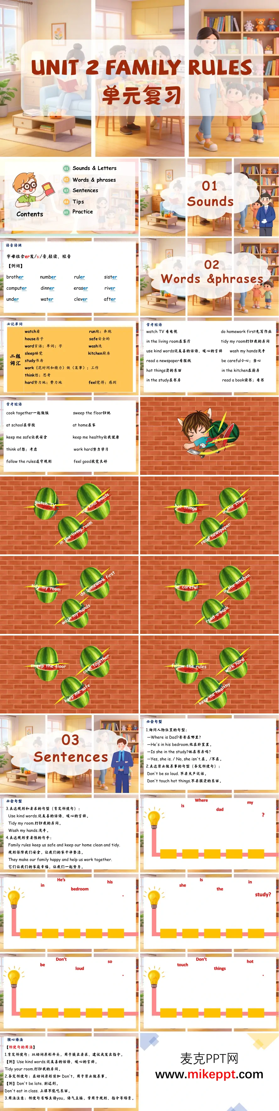 这是一份为人教版PEP四年级下册Unit 2《Family Rules》设计的单元复习课件,围绕"家庭规则与居家生活"主题,分五大模块系统梳理知识。 语音模块聚焦字母组合er发/ɜː/轻读短音的规律,列举brother、ruler、computer等例词巩固发音。词汇与短语模块汇总必记单词和常考短语,通过趣味西瓜图卡强化记忆,覆盖家庭生活与规则相关的核心表达。 句型模块梳理四类核心句型:询问人物位置、否定祈使句、肯定祈使句,以及说明规则重要性的句子,并设计句型拼接练习。技巧点拨模块拆解祈使句用法、er发音规律、位置问答句型等核心语法,搭配"提分练"进行针对性训练。 综合练习模块通过词汇运用、句型转换、补全对话、单项选择、翻译句子和短文填空等题型,全面巩固单元知识,帮助学生查漏补缺,提升综合语言运用能力。