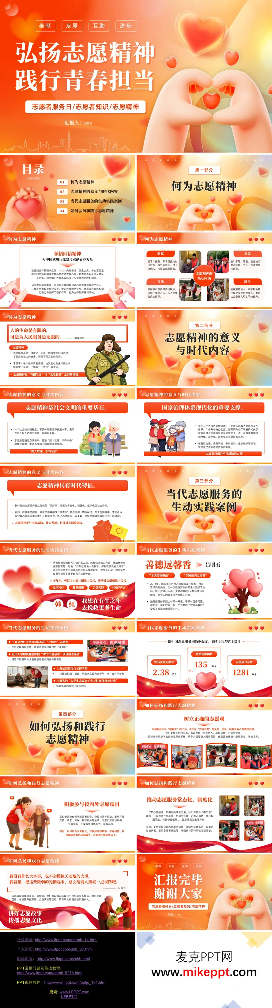 这篇PPT以“奉献 友爱 互助 进步”为核心主题,系统性地介绍了志愿服务相关知识。开篇明确“弘扬志愿精神 践行青春担当”的汇报目标,并引用了最高领导人对西部计划志愿者的回信精神,强调了将个人理想融入国家需要的重要性。 PPT从四个部分展开论述。第一部分“何为志愿精神”定义了其核心内涵:奉献(不计回报的付出)、友爱(传递平等与善意)、互助(形成“我为人人,人人为我”的循环)和进步(实现自我与社会共同成长),并指出这是连接“有限生命”与“无限服务”的桥梁。 第二部分阐述了“志愿精神的意义与时代内容”,强调它是社会文明的基石、国家治理现代化的重要支撑,并指出新时代志愿服务正朝着专业化、项目化方向拓展,与科技、国家战略深度融合。 第三部分“当代志愿服务的生动实践案例”是图文并茂的重点。图片内容展示了包括韩红(音乐人转型慈善家,成立基金会并亲力亲为)、吕明玉(“全国道德模范”,两次捐献造血干细胞并带动乡村建设)在内的个人榜样,以及宁夏的“小挎包”矛盾调解志愿者、重庆医院的儿童肿瘤患者陪伴项目、高校的“科普进校园”和“千乡万村环保科普行动”等多个团体项目案例。该部分结尾用数据图直观展示了截至2025年初,中国实名注册志愿者、志愿团队和项目总数已达到的庞大规模。 第四部分“如何弘扬和践行志愿精神”则提出了具体路径:树立正确的非功利性志愿观、积极参与校内外项目、推动志愿服务常态化与制度化,并讲好志愿故事以传播文化。PPT以“奉献 友爱 互助 进步”的志愿精神口号作结,呼吁听众践行担当。整体内容结构清晰,理论与实践结合,旨在阐释志愿精神的实质并激励行动。