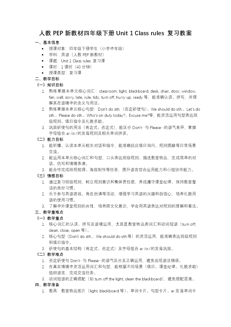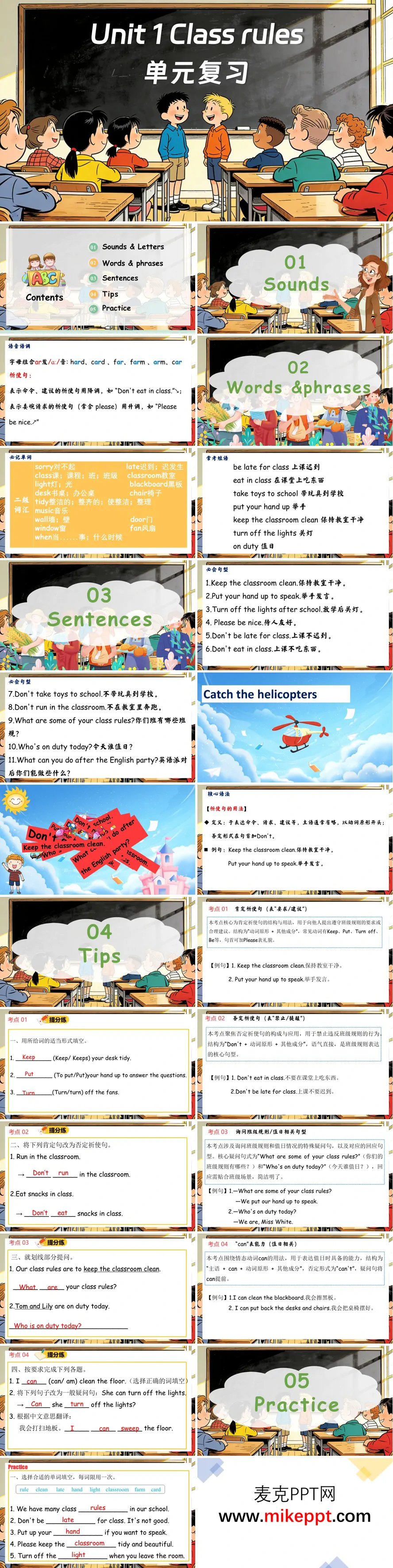 这是一份为人教PEP四年级下册Unit 1《Class Rules》设计的单元复习课件,围绕"班级规则与教室场景"主题,分五大模块系统梳理知识。 语音模块梳理字母组合ar发/ɑː/音的单词,如hard、card、arm等,并讲解祈使句的语调规则。词汇与短语模块汇总教室物品类单词及核心词汇,以及be late for class、keep the classroom clean等常考短语,夯实词汇基础。 句型模块呈现核心祈使句的肯定与否定形式,以及询问班规、值日情况的特殊疑问句,同时拓展can表能力的用法。技巧点拨模块拆解祈使句和can的用法等核心语法,结合"提分练"进行针对性训练。 综合练习模块通过单词填空、短语匹配、句型转换、补全对话和阅读理解等题型,全面巩固单元知识,检验学习效果,帮助学生查漏补缺,提升综合语言运用能力。