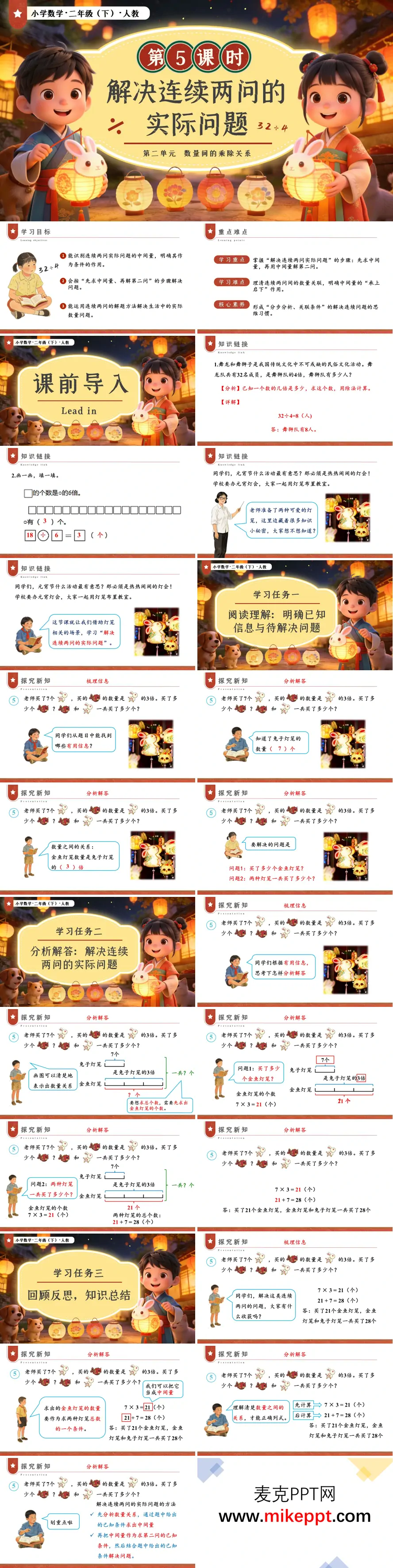 这份二年级下册《解决连续两问的实际问题》教学课件,以传统元宵灯会的喜庆情境为脉络,将数学问题融入民俗文化的生动场景之中。课堂伊始,课件呈现花灯璀璨、人流如织的节日画面,配合兔子灯、金鱼灯等传统元素,瞬间点燃学生的学习兴趣,自然引出"连续两问"的探究主题。在新知探究环节,以"兔子灯笼有7个,金鱼灯笼的数量是它的3倍,一共有多少个灯笼"为驱动问题,引导学生先有序梳理已知信息与连环设问,再通过线段图直观呈现倍数关系——将7个兔子灯视为1份量,金鱼灯对应3份量,使学生明确需先求出金鱼灯数量这一"中间量",再将其作为新条件解决"求总数"的第二问。整个教学过程层层剥茧、环环相扣,让学生在"先乘后加"的运算实践中,深刻体悟"前问为后问铺垫、后问依赖前问解答"的逻辑关联,并在回顾反思中自主提炼"读题找信息—分析理关系—分步列式算—检验写答句"的解题步骤。巩固练习延续灯会情境,设计变式问题深化理解,使抽象的乘除运算与加减融合转化为可感可知的生活智慧,有效培养学生"承上启下"的连贯思维,轻松突破连续两问问题的教学重难点。