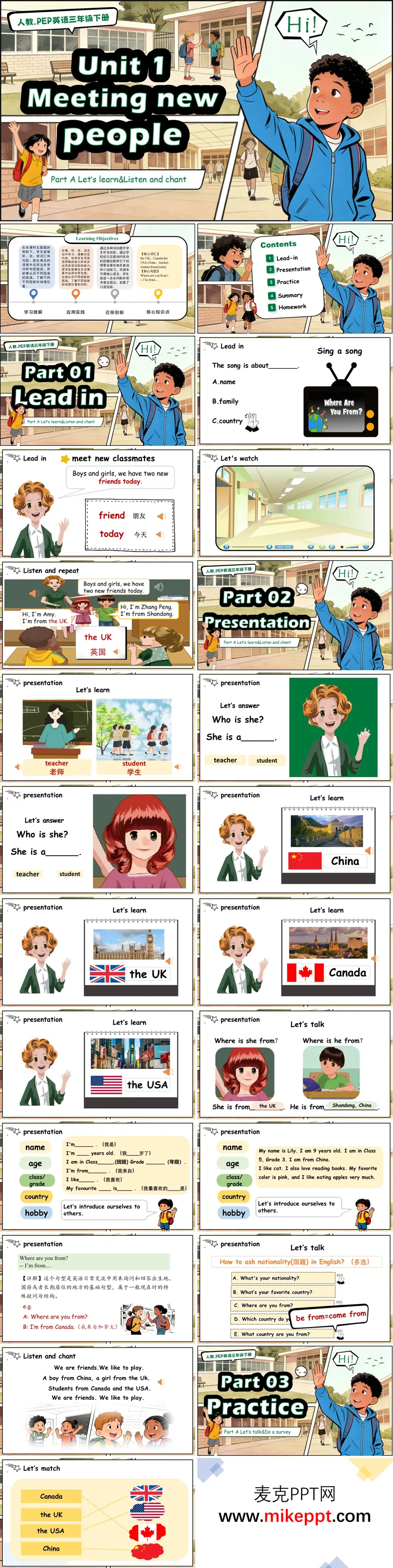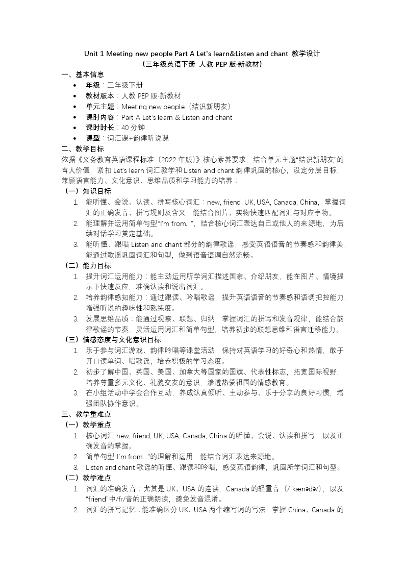 本课时围绕"认识新朋友、了解国籍"主题展开,教学设计层次清晰、活动丰富。课堂以欢快歌曲与日常问候开启,迅速营造英语学习氛围,继而依托课本情境图,通过问题链引导学生关注人物身份与国籍信息,自然切入核心内容。新授环节借助国旗、地标等视觉资源辅助词汇理解,分步呈现并操练"I'm from..."等关键句型,让学生在跟读模仿中建立语感。巩固阶段设计听音指图、配对竞赛、角色扮演等多样化活动,创设真实交际场景,促使学生在互动中熟练运用所学询问和介绍国籍。读写板块引导学生观察图片细节、补全文本信息,初步培养规范书写意识。课堂尾声系统梳理知识要点,布置听读巩固与自我介绍等实践作业,助力学生将课堂所学迁移至生活运用,整体教学情境真实、学练结合,有效促进学生口语表达与综合语用能力的提升。