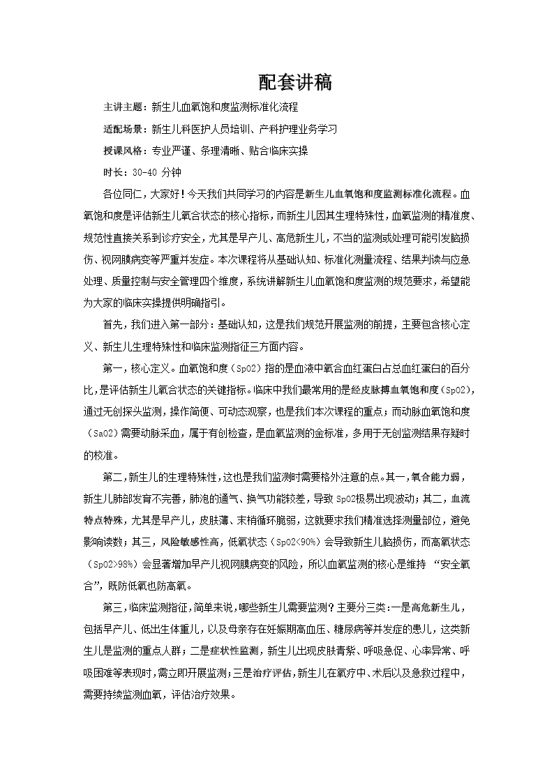 这套PPT的内容结构清晰,逻辑严密,系统地阐述了新生儿血氧饱和度监测的完整知识体系与操作规范。其核心内容可以分为四个主要部分: 基础认知:首先阐述了血氧饱和度的核心定义及其在新生儿氧合评估中的重要性。特别强调了新生儿的生理特殊性,如氧合能力弱、末梢循环脆弱以及对缺氧和高氧的敏感性,这决定了监测的特殊性。同时明确了临床监测的指征,包括针对高危新生儿、出现症状的新生儿以及治疗过程中的评估。 标准化测量流程:这是文档的核心操作部分。它严格规定了监测应在新生儿出生后特定时间窗内完成。流程详细说明了从测量前的各项准备(人员、设备、患儿、环境)、标准操作步骤(首选测量部位为右手手掌外侧、正确的探头固定方法、数据采集标准)到操作后的规范处理(设备维护、患儿护理、废弃物处置)。其中以表格形式清晰列出了术前准备的具体要求,具有很强的指导性。 结果判读与应急处理:本部分建立了明确的数值判断标准,给出了正常参考范围(90%-98%)及异常类型(低氧血症、高氧血症、数据异常波动)的判定标准与可能原因。更重要的是,它提供了清晰的应急处理流程指引,针对不同异常情况(如低氧时清理气道、调整氧供;高氧时降低氧浓度)给出了具体的临床干预步骤,将监测与临床行动紧密结合。 质量控制与安全管理:最后部分着眼于监测的准确性与安全性。它分析了可能导致测量误差的技术因素(如探头问题、低体温)和病理因素,并提出了规避方法。同时强调了护理过程中的安全要点,如持续监护、规范记录和健康宣教,并对设备的日常维护与耗材管理提出了明确要求。 总的来说,这套PPT是一份专业、实用的临床指南,其内容贯穿了从理论认知、标准化流程、结果解读到质量控制的完整闭环,旨在通过“精准监测”来“护佑新生”,体现了严谨的医疗规范和对新生儿安全的高度重视。