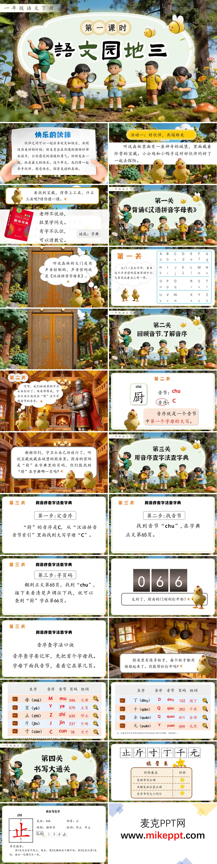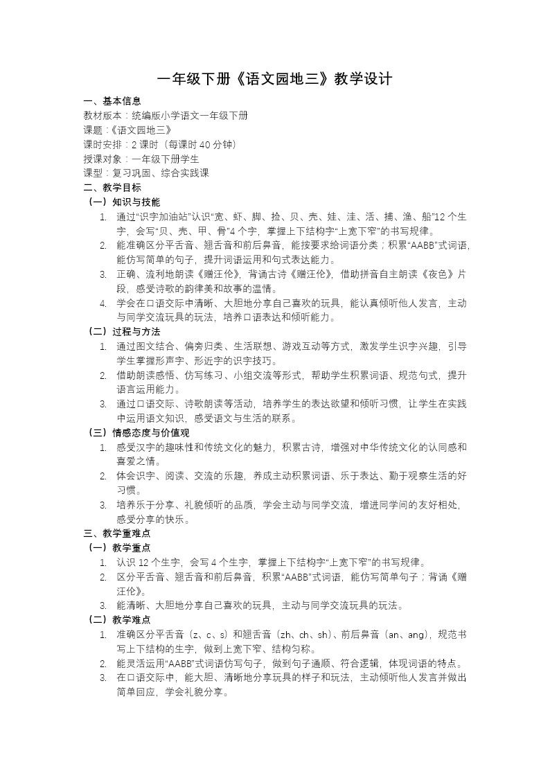 本套《语文园地三》教学设计以"小公鸡和小鸭子探险寻宝"为情境脉络,将工具习得、经典诵读与情感熏陶有机融合为趣味盎然的语文探索之旅。第一课时以闯关游戏激发学习动力,先从背诵《汉语拼音字母表》夯实基础,逐步引导学生建立音序概念;继而分步拆解音序查字法的操作要领,结合"止、斤、寸"等生字的实例演练,让学生在动手实践中掌握独立识字的金钥匙,同步落实规范书写指导。随后穿越时空,借助图文对照与诗意品读,引领学生诵读李白《赠汪伦》,在"桃花潭水深千尺"的千古名句中体悟诗人与友人之间真挚深厚的惜别之情。第二课时延续友谊主线,通过儿歌《谁和谁好》的朗读赏析与话题讨论,启发学生发现生活中藤与瓜、蜜蜂与花等和谐共生的友好关系,进而迁移至自身,感受同伴相处的温暖与美好。整体编排紧扣一年级学生认知规律,以探险寻宝的情境贯穿始终,在层层递进的游戏化任务中,既扎实培养识字查字能力,又润物无声地播撒友爱的种子,让语文课堂充满探索的乐趣与人文的温度。