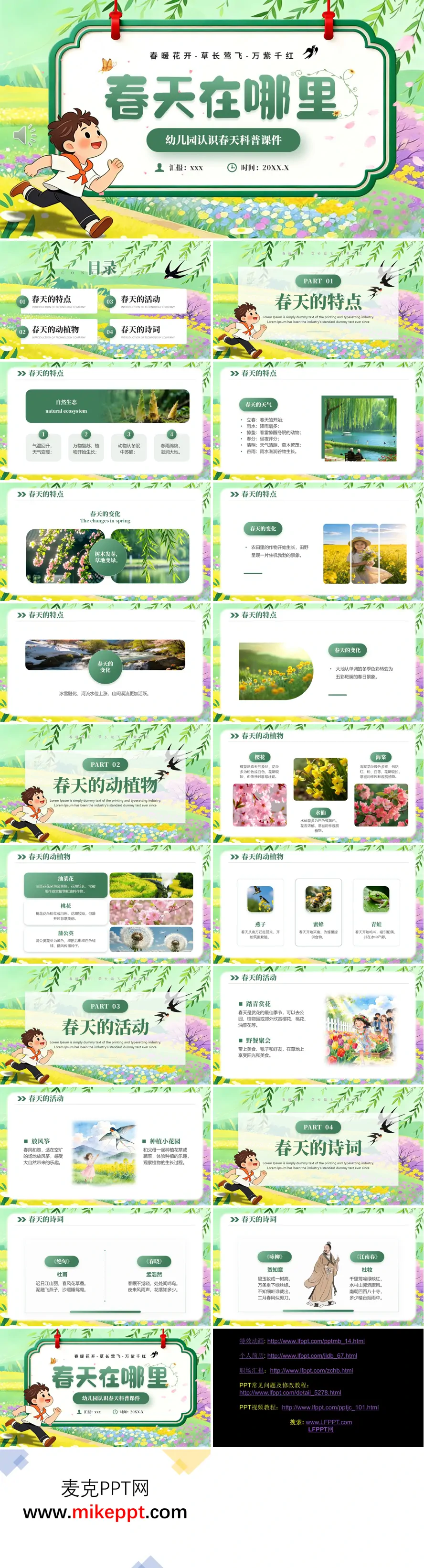 这套PPT是一份面向幼儿园小朋友的、关于认识春天的科普课件。它以“春暖花开-草长莺飞-万紫千红”为主题,旨在生动、直观地引导孩子们了解春季的自然景象、动植物和活动。 课件首先介绍了春天的特点,包括气温回升、万物复苏、春雨滋润大地等自然变化,并展示了立春、雨水、惊蛰、春分、清明、谷雨六个节气。通过“春天的变化”部分,用图片呈现了树木发芽草地变绿、农田生机勃勃、冰雪融化溪流活跃以及大地色彩变得五彩斑斓等具体场景。 接着,课件用大量精美的花卉和动物图片展示了春天的动植物。植物方面,重点介绍了樱花、水仙、海棠、油菜花、桃花和蒲公英。动物方面,则介绍了春天回归的燕子、忙碌采蜜的蜜蜂以及开始鸣叫繁殖的青蛙。 随后,课件鼓励孩子们亲近自然,参与春天的活动,包括踏青赏花、野餐聚会、在春风中放风筝,以及和父母一起种植小花园,体验种植的乐趣。 最后,为了增添文化意蕴,课件还选取了多首经典春天的诗词,如杜甫的《绝句》、孟浩然的《春晓》、贺知章的《咏柳》和杜牧的《江南春》,让孩子们在欣赏美景的同时,也能感受古诗词中春天的意境。