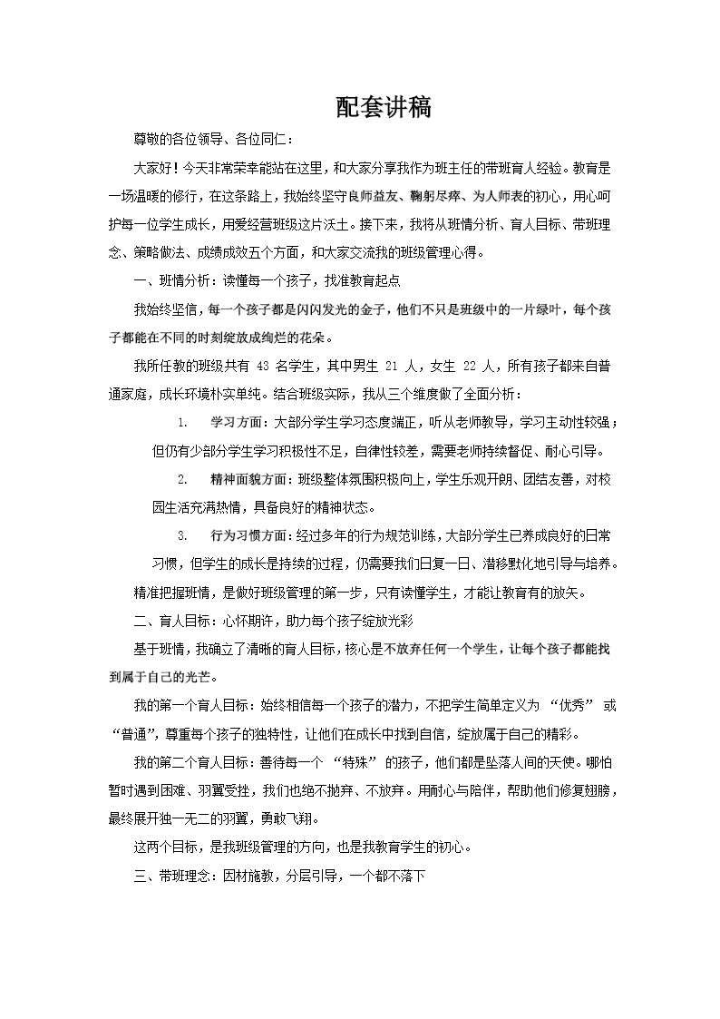 这套PPT题为“优秀教师培训交流大会”,由一位老师在202X年分享其班主任工作实践与心得的汇报材料。整个文档围绕“鞠躬尽瘁,良师益友,为人师表”的主题展开,结构清晰,分为五个主要部分。 第一部分:班情分析。汇报者介绍了所带班级的基本情况,总共有43名学生,男女比例均衡。对学生的学习态度、精神面貌和行为习惯进行了简要分析,认为大部分学生表现良好,但仍有少部分需要持续关注与引导。 第二部分:育人目标。此部分体现了教师的教育理念,核心是相信每个学生都是“闪闪发光的金子”,能在不同时刻绽放。同时,强调了对特殊学生(比喻为“天使”)的不放弃,旨在帮助每个孩子“再次飞翔”。 第三部分:带班理念。汇报者提出要根据学生不同的学习基础和学习态度,因材施教,为不同层次的学生(基础好、中等、较差)设定差异化的学习目标,如追求卓越、稳步前进和端正态度不放弃。 第四部分:策略做法。这是文档中最详尽的部分,分三个层面阐述了具体的管理方法: 1. 树立大教育观,让德育润物无声:通过日常“微德育”、精心准备班会课,利用传统文化和时事,潜移默化地进行思想品德教育。 2. 创新实践,打造示范引领的班集体:包括建立“我的小目标”、“我的小岗位”班级文化,以及实施“班主任督导+小导师引领”的双线管理模式,通过小组合作与评价激励学生自主管理。 3. 多元化沟通育人方略:介绍了“吐槽”式周记、思维导图式周记和“心灵相约——天天故事会”等多种创新沟通方式,旨在深入了解学生,拉近师生距离,实现有效管理。 第五部分:成绩成效。汇报者总结了自己从初一带班至初三的成果,指出学生成长明显,班级凝聚力强,在各种活动中取得优异成绩,并连续三年获得综合考评优秀。 整体而言,这份PPT系统展示了一位班主任如何将“以生为本”的理念转化为具体的班级管理策略,内容翔实,方法具有可操作性和创新性。