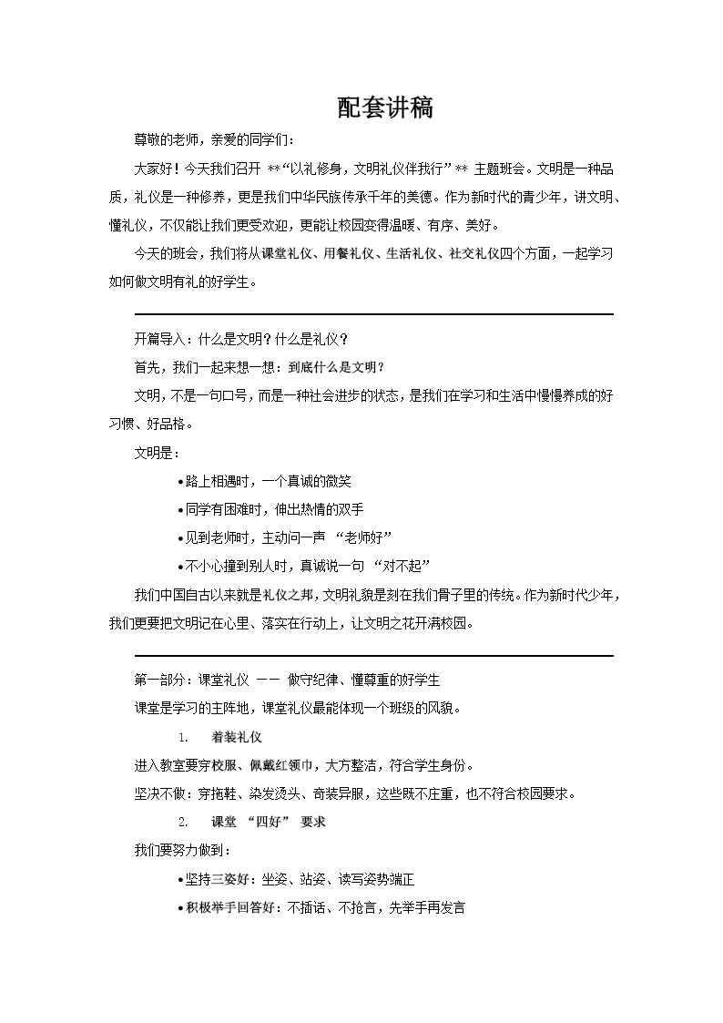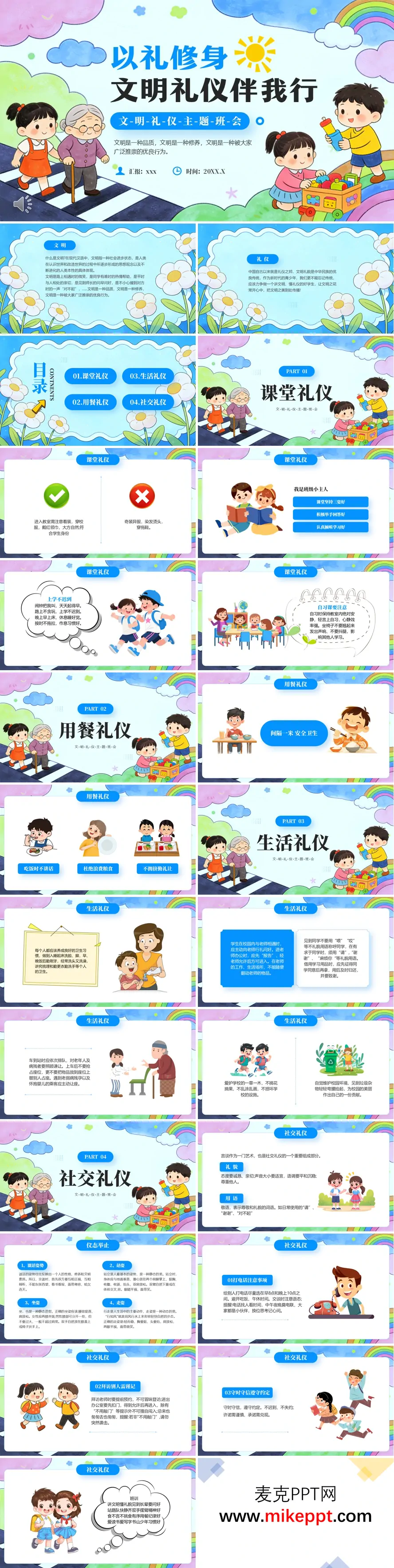 这套PPT的主题是“以礼修身 文明礼仪伴我行”,是一份“文明礼仪主题班会”的演示文稿。其内容围绕“文明”与“礼仪”展开,旨在倡导小学生(或青少年)在日常生活中践行文明行为。 它是一种社会进步状态和优良行为,体现在微笑、互助、问候、道歉等日常细节中。接着,强调了作为“礼仪之邦”的传人,讲文明、懂礼仪的重要性。 PPT的核心内容分为四个主要部分: 1. 课堂礼仪:强调学生应着装得体(穿校服、戴红领巾),遵守课堂纪律(保持“三姿”、积极举手、认真倾听),做到上学不迟到,并在自习课时保持安静,不影响他人。 2. 用餐礼仪:提倡在用餐时保持安全间隔(一米线),但具体细节在提供的内容中未完全展开。 3. 生活礼仪:涵盖了个人卫生、尊师(主动问好、进办公室前报告)、友爱同学(使用礼貌用语、借用物品要征得同意并致谢)、公共交通礼仪(排队、让座)以及爱护校园环境(不破坏公物、主动捡拾垃圾)等多个方面。 4. 社交礼仪:这部分内容较为丰富,包括言谈的艺术(态度诚恳、使用敬语)、正确的仪态举止(谈话、站姿、坐姿、走姿)。此外,还特别列出了具体场景下的礼仪规范,如打电话要避开休息时间、拜访他人需提前预约并守时守信。最后,PPT以班训、宣誓和社会主义核心价值观作结,号召大家从细节做起,让文明礼仪相伴成长。 整体而言,这套PPT结构清晰,从课堂、用餐、生活到社交,由内而外、由近及远地阐述了小学生应遵循的文明礼仪规范,图文并茂,具有教育和引导意义。