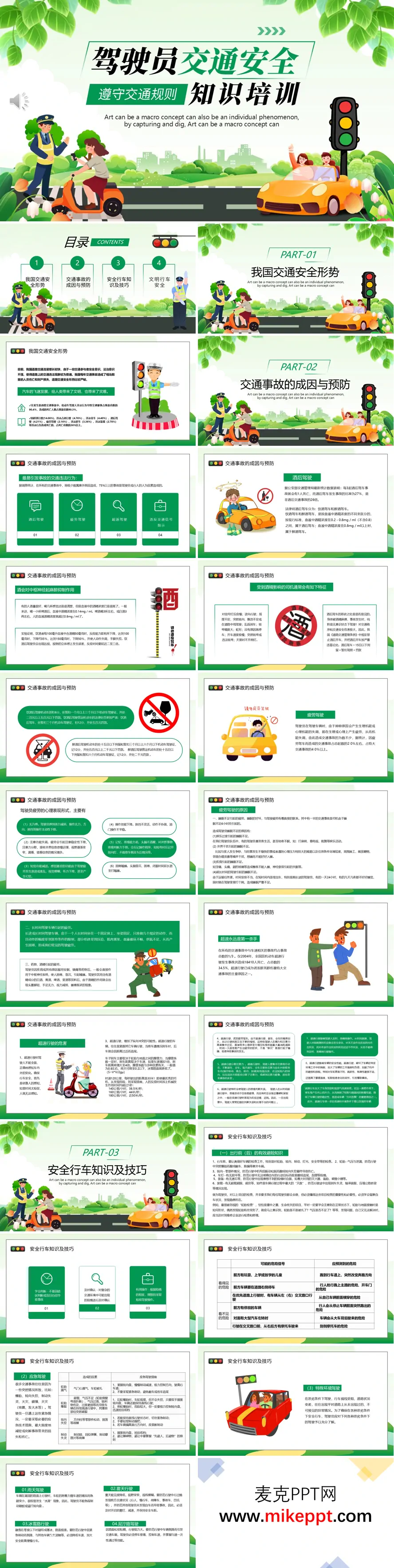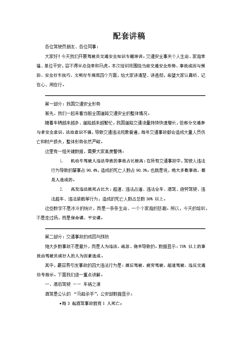 这篇PPT是一份关于驾驶员交通安全与知识培训的文档。其内容结构清晰,旨在系统性地讲解交通安全知识,提升驾驶员的安全意识和操作技能。 文档主要分为四个部分: 第一部分分析了“我国交通安全形势”,指出当前道路交通流量大,但部分参与者安全意识淡薄,导致交通事故频发,其中机动车驾驶人违法行为是导致事故的主要原因,占比超过90%。 第二部分重点剖析“交通事故的成因与预防”,详细列举了最易引发事故的几大交通违法行为,包括酒后驾驶、疲劳驾驶和超速行驶。文档提供了具体数据(如酒后驾车发生事故的概率是非酒后的26倍)和科学解释(如酒精如何影响驾驶员的反应和视觉),并明确了相关的法律处罚规定。同时,深入分析了疲劳驾驶的心理和生理表现、形成原因,以及超速行驶带来的多重危害。 第三部分讲解了“安全行车知识及技巧”,包括出车前对车辆关键部位(如轮胎、转向、制动)的检查、行车中对可见与不可见风险的预判、以及遇到爆胎、制动失灵等紧急情况时的应急驾驶措施。此外,还介绍了在雨天、雾天、冰雪路等特殊环境下的安全驾驶要领。 第四部分强调了“文明行车安全”,列举了不文明行车的具体表现(如溅人泥水、滥用远光灯),并倡导驾驶员应遵守职业道德,做到礼让行车,共同营造安全的道路环境。 整体而言,这份PPT从宏观形势到具体成因,从预防知识到实操技巧,再到文明驾驶规范,构建了一套完整的驾驶员安全教育体系。