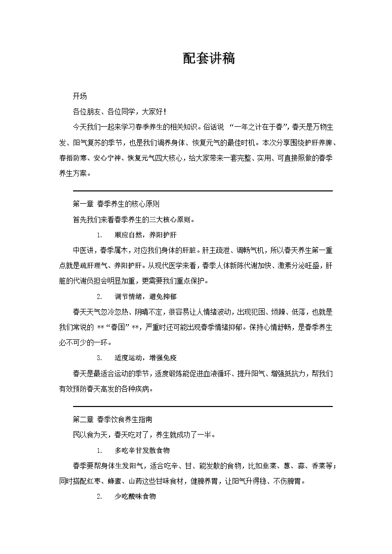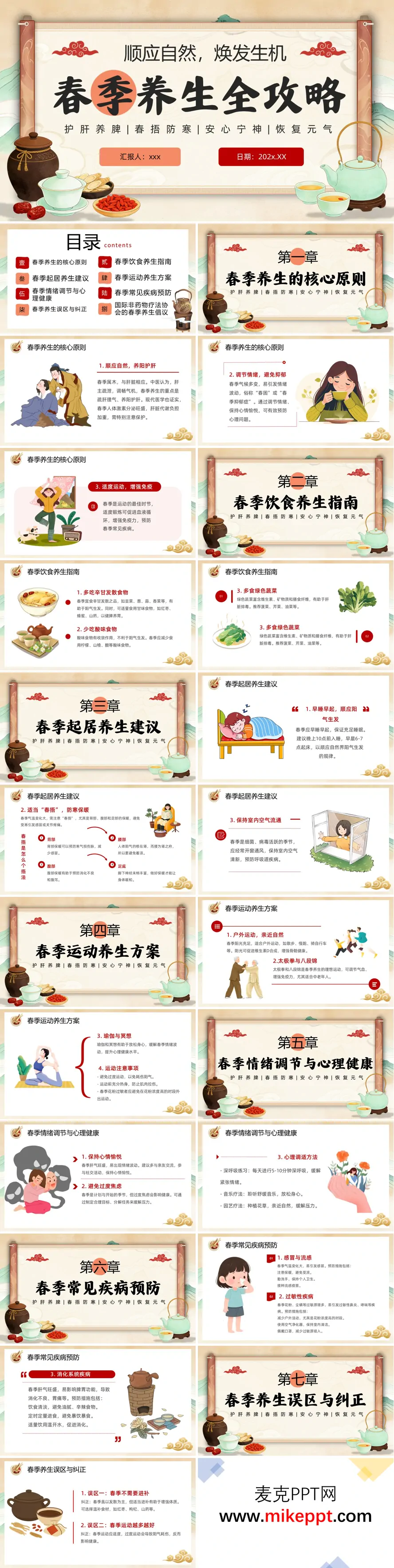 这套PPT以“顺应自然,焕发生机”为主题,系统性地阐述了春季养生的全攻略。其内容围绕中医“护肝养脾、春捂防寒、安心宁神、恢复元气”的核心原则展开,共分为八个章节。 首先,PPT明确了春季养生的核心在于顺应自然、养阳护肝、调节情绪和适度运动。接着,在饮食方面,指南建议多吃辛甘发散(如韭菜、葱)和绿色蔬菜以助阳气生发与肝脏排毒,同时应减少酸味食物的摄入。起居方面,强调了“早睡早起”以顺应阳气,并详细解释了“春捂”的重要性,需特别注意背部、腹部、腰部和足底的保暖。运动方案则推荐户外活动、太极拳、八段锦、瑜伽和冥想,并提醒注意适度与防护。针对春季易出现的情绪波动,PPT提供了保持愉悦、避免焦虑及具体心理调适方法。在疾病预防部分,重点涵盖了感冒流感、过敏性疾病及消化系统问题的预防措施。PPT还纠正了“春季不需进补”、“运动越多越好”及“不需防晒”等常见误区。最后,PPT介绍了国际非药物疗法协会的倡议,包括推广自然疗法、加强公众教育和支持相关研究,整体倡导以科学、自然的方法在春季调养身心,拥抱健康。