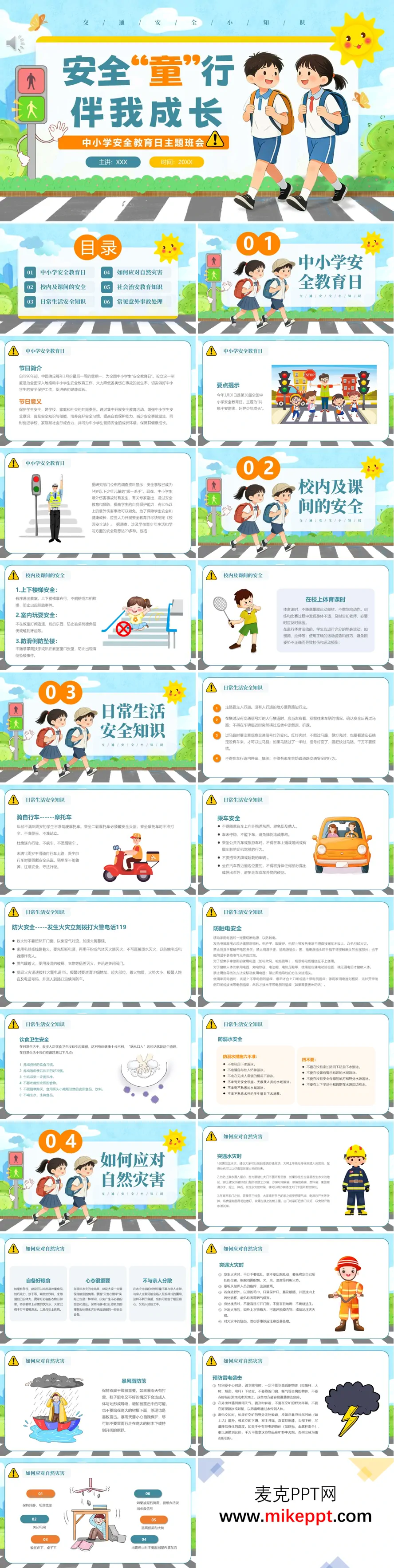 这是一套专为中小学生设计的卡通风格安全教育班会课件,围绕全国中小学安全教育日展开。内容从节日背景引入,依次覆盖校园日常安全(上下楼梯、课间活动、体育课)、生活安全(交通、防火防电、饮食、防溺水)、自然灾害应对(水灾、火灾、地震等)及社会治安防护(防拐骗、防欺凌、防诈骗),最后补充常见意外急救知识。整体结构层层递进,用生动插画和通俗语言传递实用技能,贴合学生认知特点,便于教师开展主题班会。