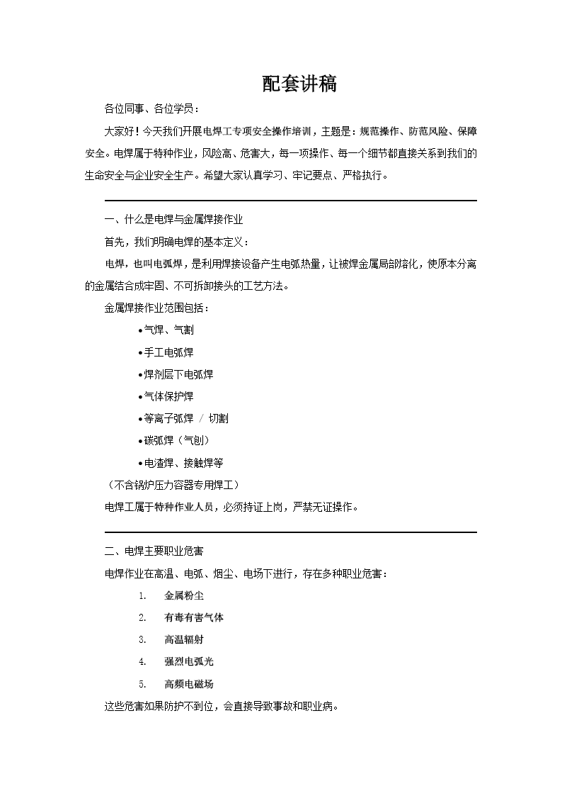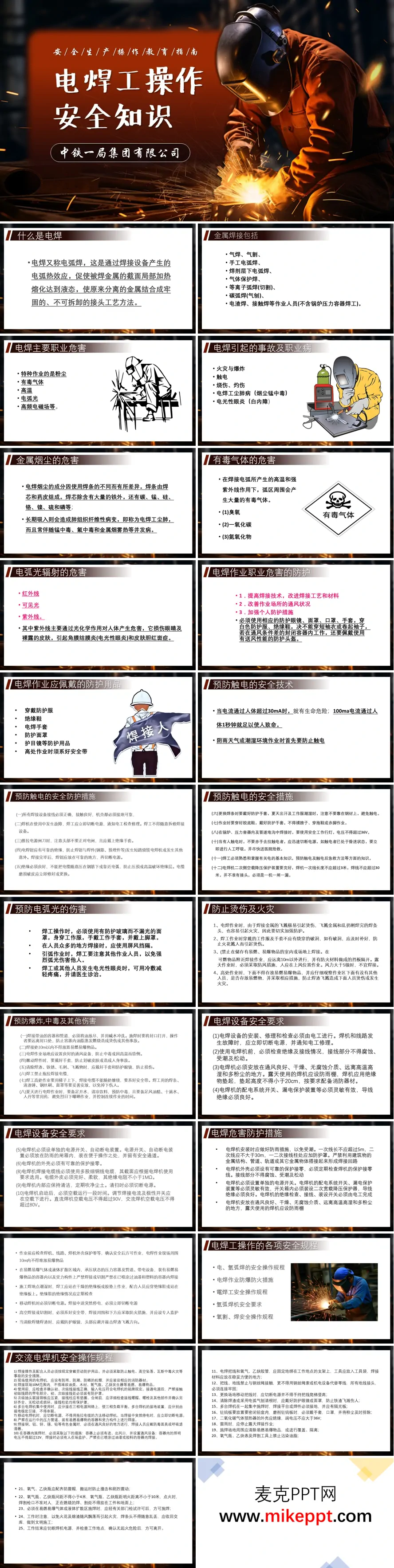 这套《电焊工操作安全知识》PPT描述其核心内容。 这份由中铁一局集团有限公司编制的PPT是一份面向电焊工的系统性安全教育培训材料。其主要围绕电焊作业中的职业危害、事故风险以及全面的安全操作规程展开。 文档首先阐述了电焊(电弧焊)的基本定义和金属焊接的主要类型。核心部分详细列举了电焊作业的主要职业危害,包括金属烟尘(可导致尘肺病、锰中毒)、有毒气体(如臭氧、一氧化碳)、电弧光辐射(可引发电光性眼炎)以及火灾、爆炸、触电等事故风险。 针对这些风险,文档重点介绍了多层次、系统化的防护措施。这包括技术改进(如改善焊接工艺和通风)、严格的个人防护装备要求(如防护服、绝缘鞋、电焊手套、防护面罩、护目镜等),以及在高处、密闭空间等特殊环境下的额外安全规定。文档用大量篇幅详述了预防触电的安全技术措施,如设备接地、规范操作、潮湿环境作业要求及触电急救方法。此外,也明确了防止烫伤、火灾、爆炸的具体操作规程。 最后,文档对电焊设备本身的安全要求(如安装、检查、维护规范)和电焊工、气割焊的安全操作规程进行了系统性规定,强调了持证上岗、作业现场管理(如与易燃易爆物品保持安全距离)以及结束作业后的安全检查流程。整份文档旨在通过全面的知识普及和严格的规程要求,最大限度地保障电焊作业人员的职业健康与生命安全。