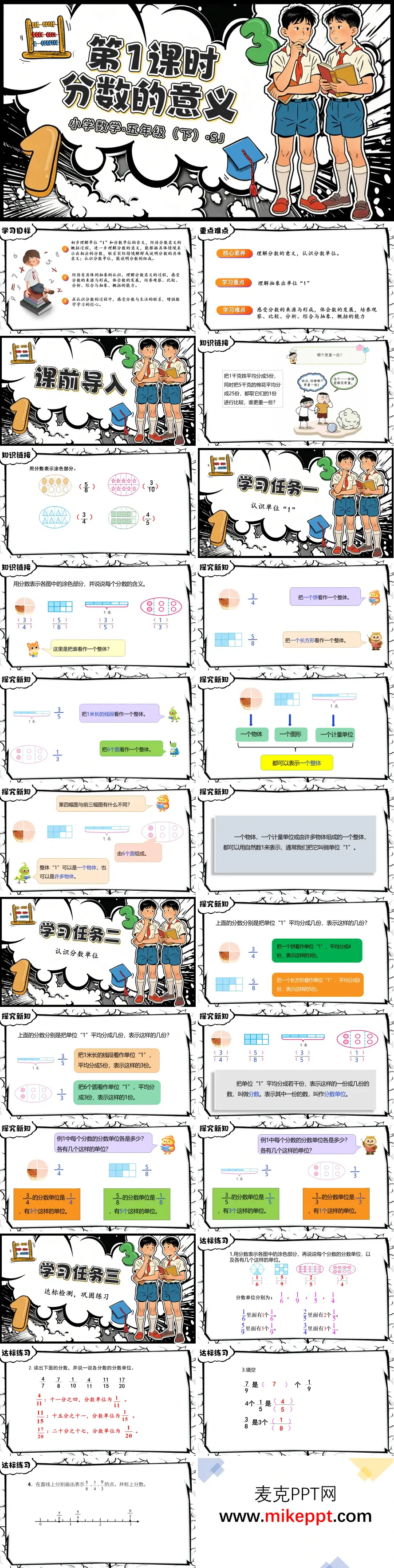 这是苏教五年级下册数学《分数的意义》教学课件,共31页,围绕分数核心概念展开。 学习目标与导入板块明确:理解单位"1"和分数单位的含义,能结合情境解释分数意义。以"比较铁块和棉花份数重量"的问题引入,同时回顾用分数表示涂色部分的旧知。 核心探究板块分三部分:一是认识单位"1",通过饼、长方形、线段、圆组等实例,说明一个物体、一个计量单位或多个物体组成的整体都可看作单位"1";二是分数的意义,把单位"1"平均分成若干份,表示这样的一份或几份的数就是分数;三是认识分数单位,把单位"1"平均分成若干份,表示其中一份的数叫分数单位。 练习与总结板块通过涂色表示分数、读分数说单位、数轴标分数、解决实际问题等练习巩固知识;最后梳理知识点,布置课后作业,强化对分数意义的理解与应用。