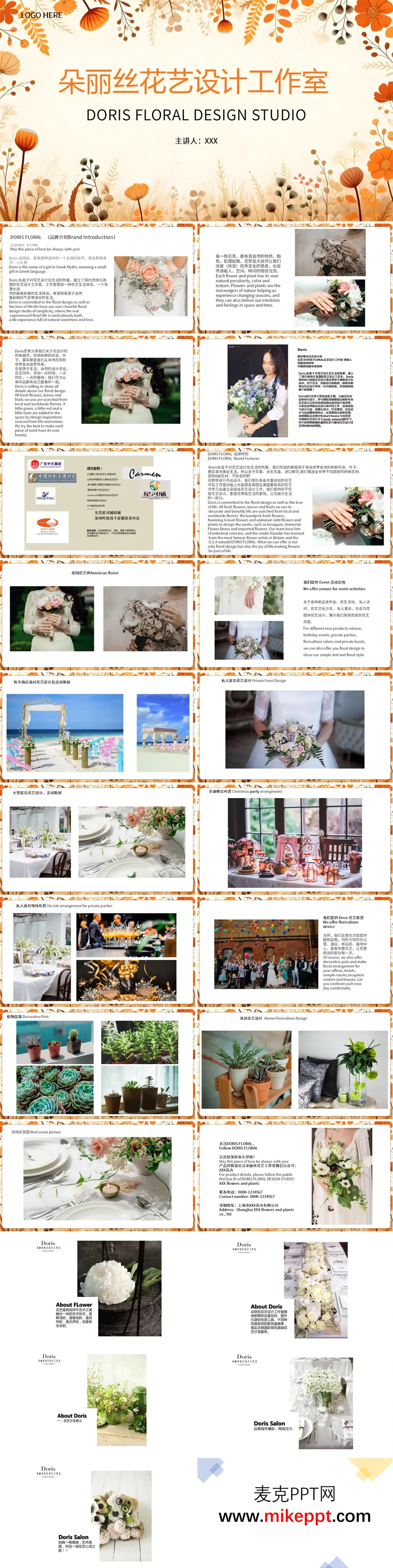 这套花艺设计课件以温暖清新的视觉风格呈现朵丽丝工作室的品牌全貌。开篇阐释"源于自然、传递生活之美"的设计理念,建立品牌认知基础;继而展示核心优势,包括与美国花艺师的合作背景,以及融合本地花材与全球花卉的创新设计思路。主体部分通过婚礼、宴会、私人派对等商业场景案例,结合家居花艺、植物盆栽等生活化设计,直观呈现多元风格与落地效果。末章延伸至花艺沙龙与课程服务,构建从欣赏到实践的学习闭环。整体图文结合、循序渐进,兼顾美学传达与技法传递,适用于花艺爱好者入门及从业者进阶参考。