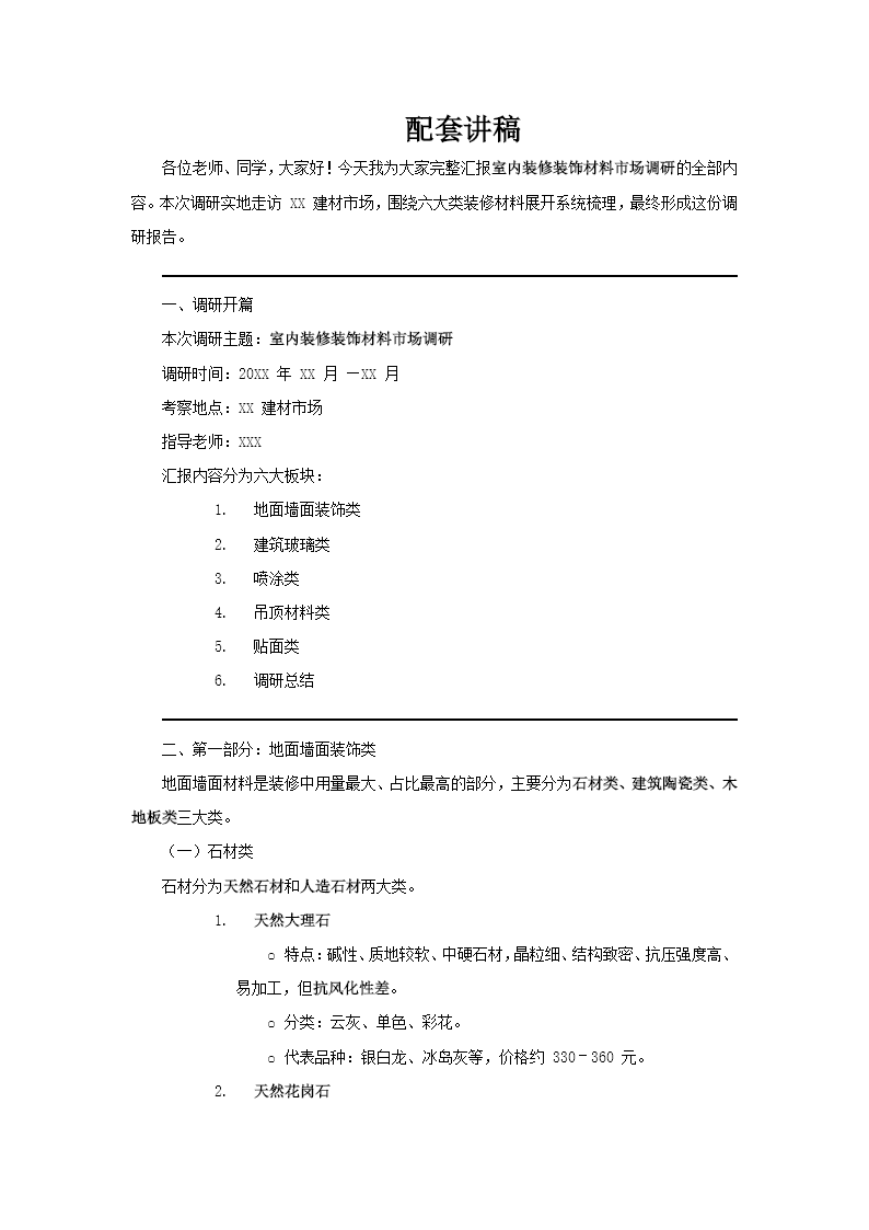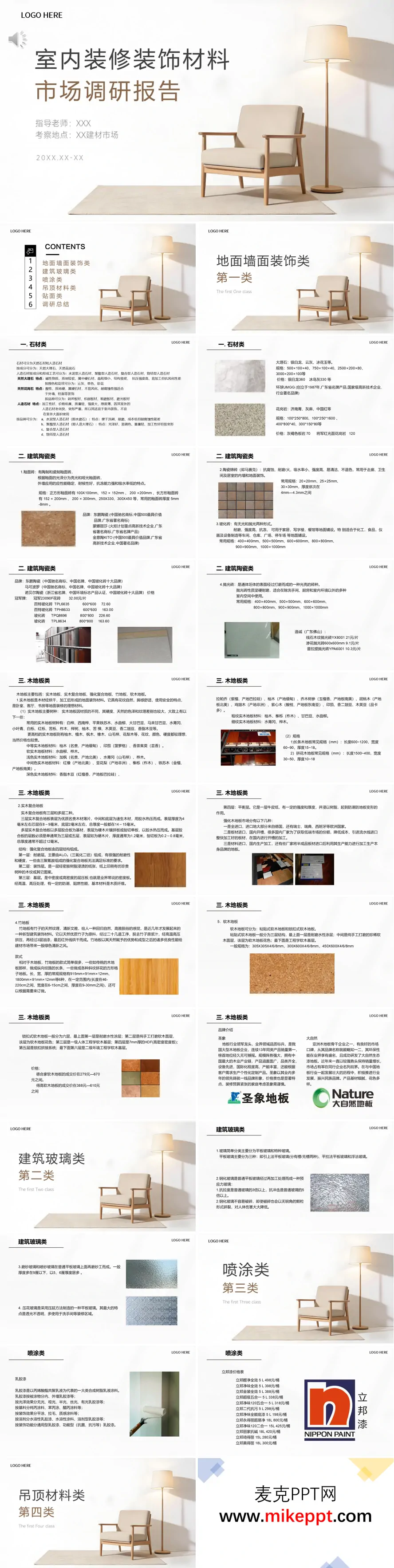 这套PPT以简约原木风为基调,系统讲解室内装修装饰材料。开篇明确调研背景与目录框架,随后分类解析:地面墙面类涵盖石材、陶瓷、木地板等材质特性、品牌与规格;建筑玻璃类、喷涂类、吊顶材料类、贴面类材料则逐一梳理分类、工艺及应用场景,最后以调研总结收束。 整套PPT图文并茂、数据详实,兼顾材料基础认知与市场价格、品牌信息,逻辑清晰且实用性强,适合装修教学或市场调研展示,帮助观众全面了解室内装饰材料的市场现状与应用知识。