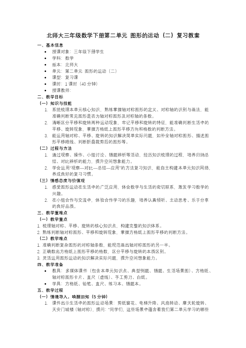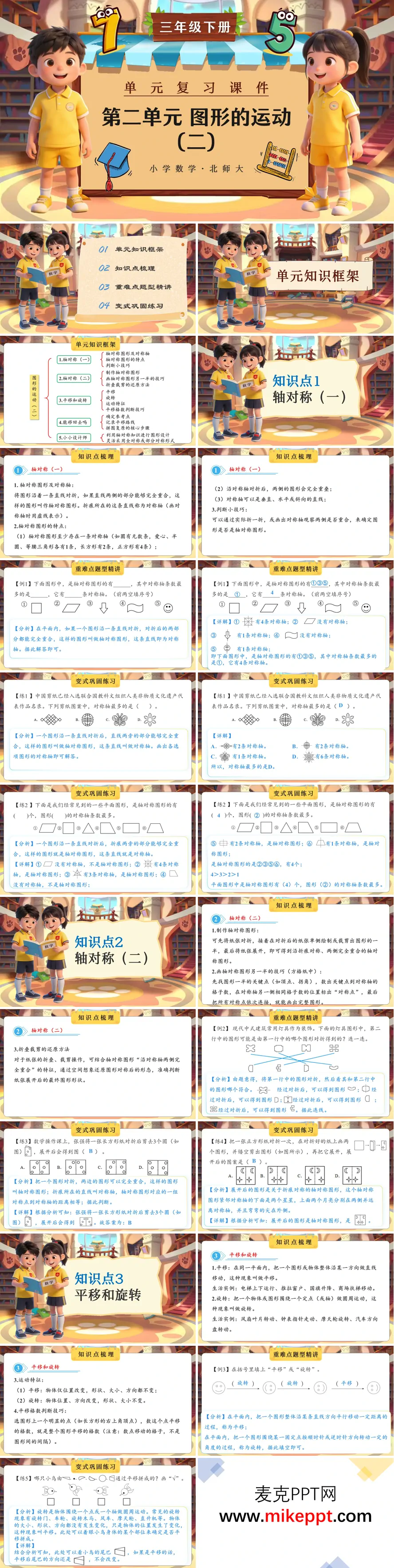 这是北师大三年级下册数学第二单元《图形的运动(二)》复习课件,共41页,结构清晰、贴合学情。 课件先搭建单元知识框架,梳理出5大核心模块:轴对称(一)、轴对称(二)、平移和旋转、能移回去吗、小小设计师。在知识点梳理部分,重点讲解轴对称图形的定义、对称轴数量判断、制作与剪纸还原技巧;明确平移(物体位置变、形状大小方向不变)和旋转(物体位置和方向变、形状大小不变)的概念与生活实例;还介绍平移格数的判断方法,以及利用对称、平移、旋转进行图案设计的技巧。 通过重难点题型精讲和变式巩固练习,结合剪纸、灯具、动车等生活场景,让学生在判断、操作、设计中巩固图形运动知识,培养空间想象能力。整体设计童趣直观,是一份实用的单元复习资料。