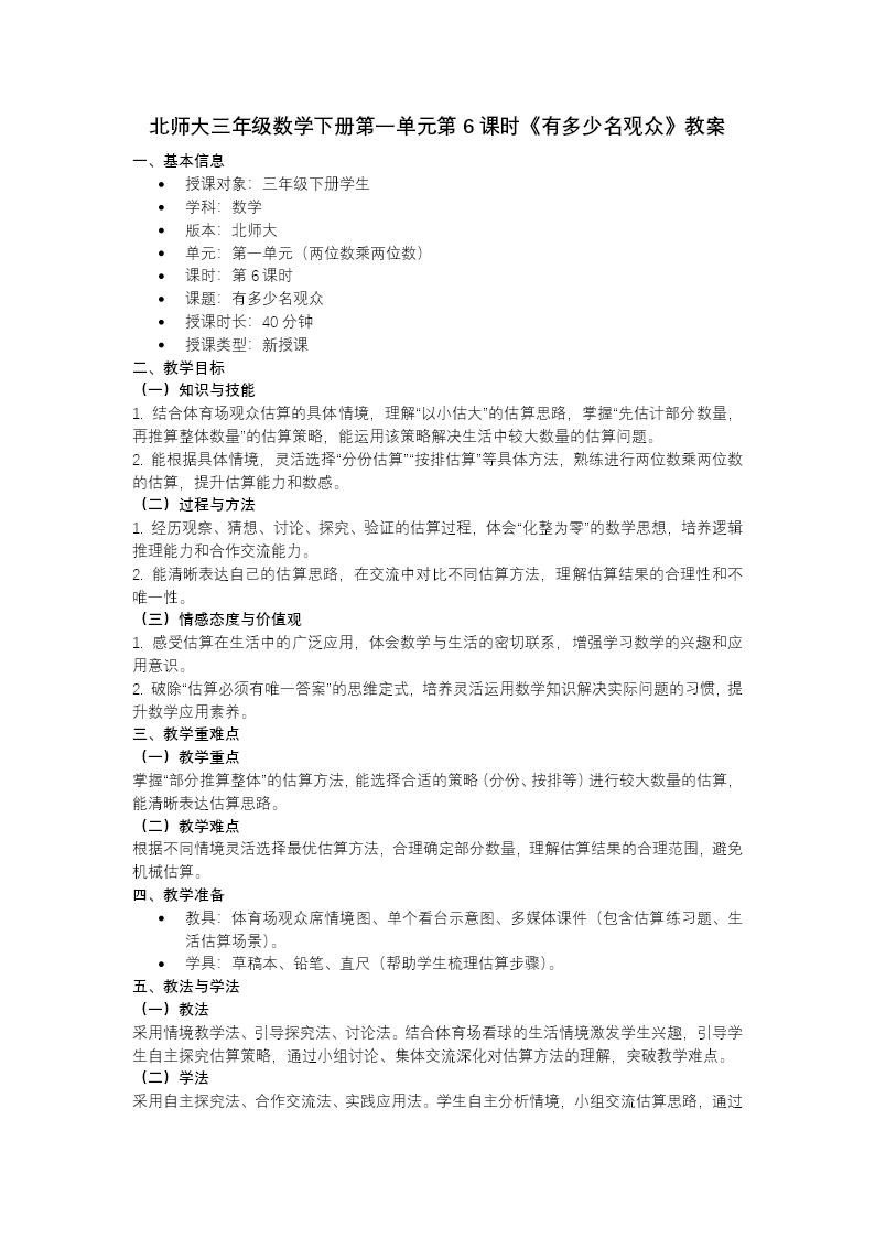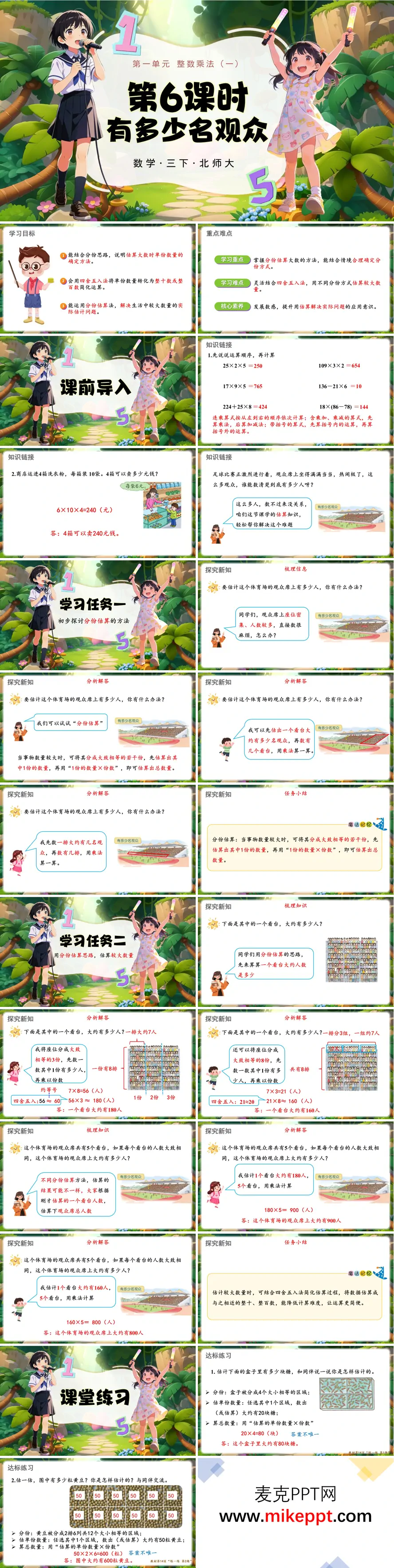 这是北师大三年级下册数学《有多少名观众》教学课件,共28页,围绕分份估算大数的方法展开。 开篇明确学习目标:结合分份思路说明估算方法、用四舍五入简化计算、解决生活中较大数量的估计问题;点明重点是掌握分份估算,难点是灵活选择分份方式。课前导入用连乘运算和生活实例铺垫,随后以"估算体育场观众人数"为核心情境,引导学生探究分份估算:将大量事物分成大致相等的若干份,先估1份数量,再乘份数得总量。 学习任务二以单个看台为例,演示不同分份方式(3份/8份),结合四舍五入简化计算,再推广到5个看台的总人数估算,让学生体会"分份→估单份→算总量"的完整流程。课堂练习通过"估糖块""估黄豆"巩固方法,最后总结分份估算的核心步骤,强调有序思考和简化运算的策略,培养学生数感与用估算解决实际问题的能力。