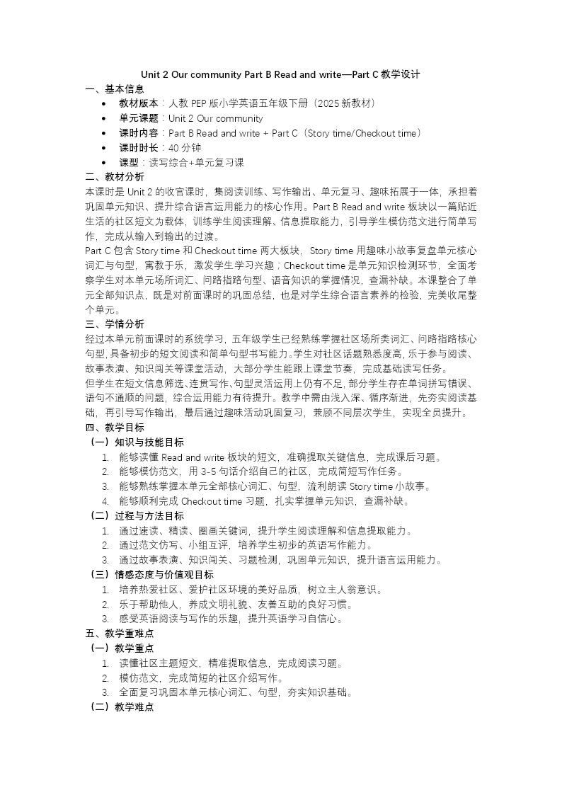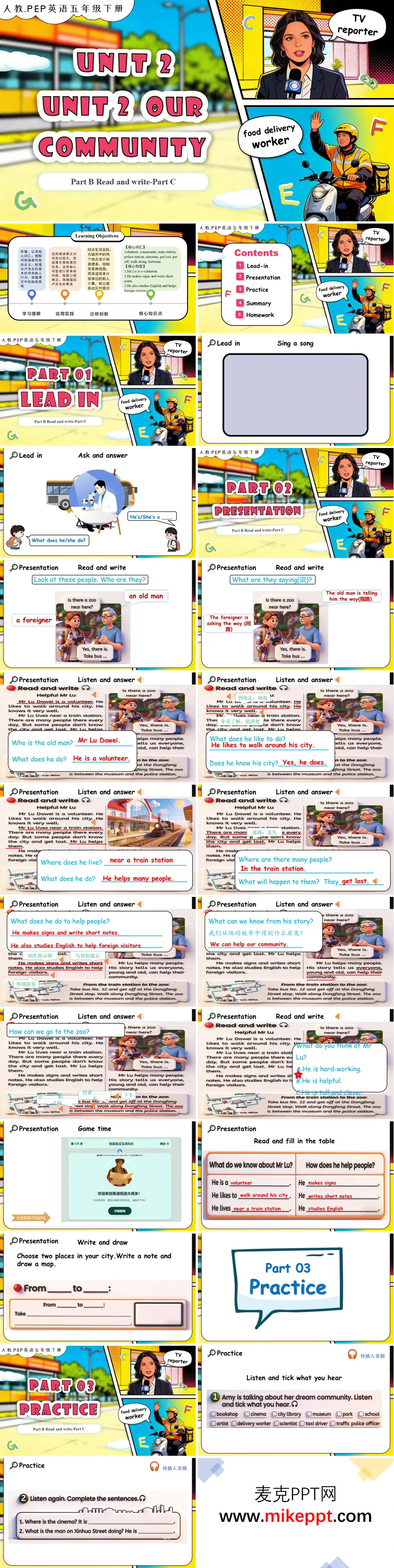 这是一套人教版PEP五年级下册Unit 2《Our community》Part B Read and write至Part C的教学课件,以"社区与职业"为主线,教学环节环环相扣。 导入环节通过歌曲热身与职业问答,快速激活学生已有知识,自然引入主题。 新知学习以志愿者卢大伟的故事为载体:学生听读文本回答问题、梳理人物信息,学习volunteer等核心词汇及指路表达;穿插闯关游戏、表格填空强化理解,并渗透服务社区的德育理念。随后通过写便签、画地图等活动落实读写结合。 拓展练习设计多元任务:听力训练夯实基础,"设计理想社区"激发创意,分享真实社区促进表达,认读社区职业拓展认知,全方位提升听说读写能力。 总结作业梳理核心知识,构建完整框架;分层布置听读课文、讲述故事、畅谈理想职业等任务,兼顾语言基础与素养发展,契合小学生学习规律,有效促进学生语言能力与综合素养的同步提升。