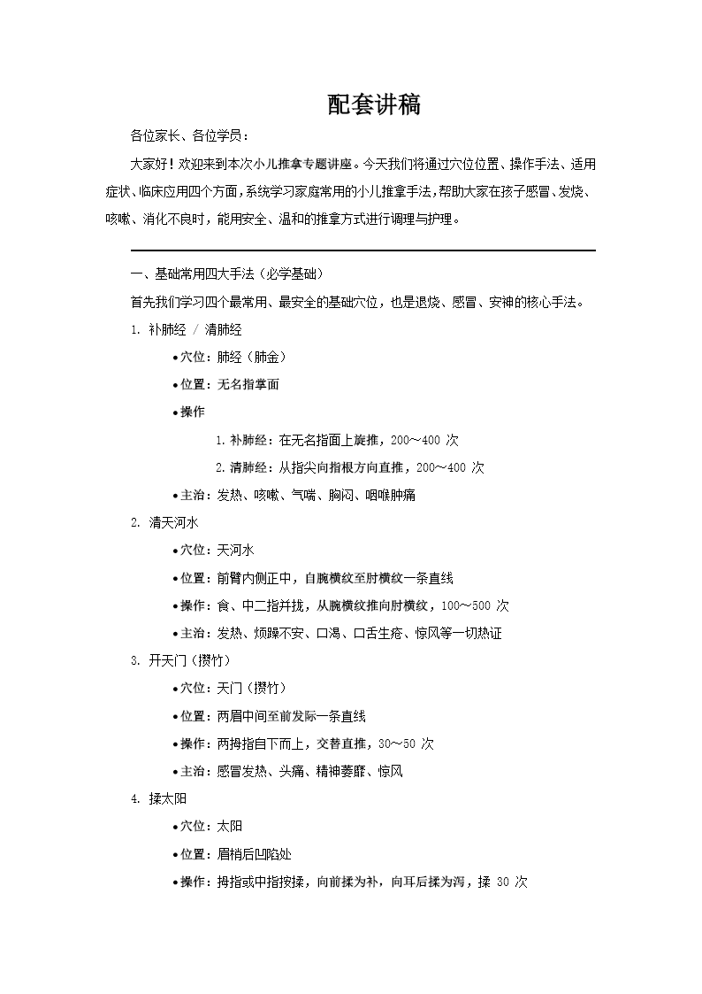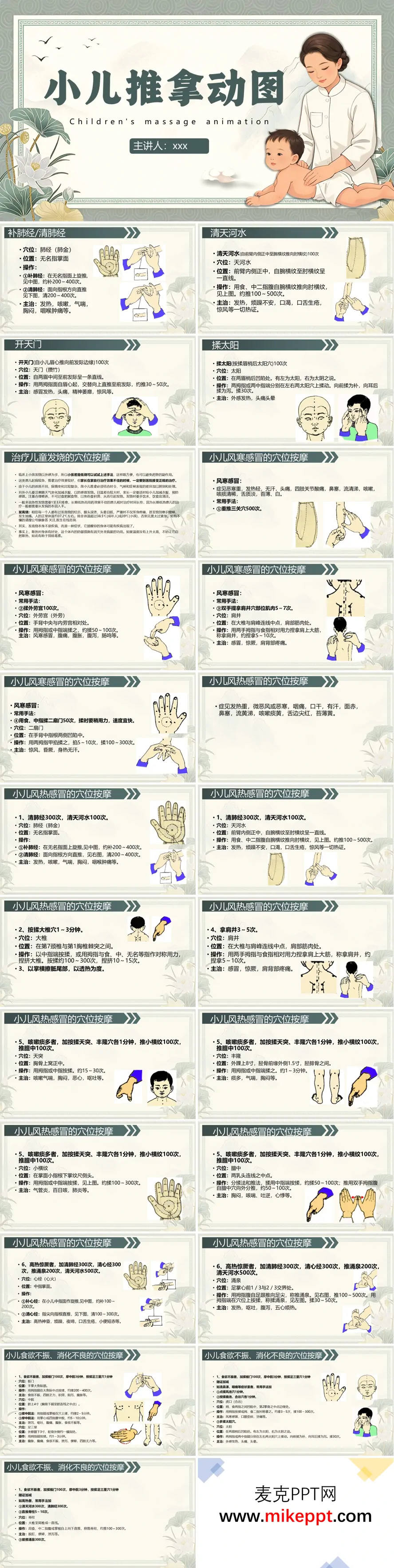 这份PPT系统介绍了小儿推拿按摩的常用穴位与手法,涵盖四大临床应用场景。内容以图文结合的方式,详细展示了多种小儿常见病症的推拿治疗方案。 在基础手法部分,PPT讲解了补肺经/清肺经、清天河水、开天门、揉太阳等核心技法,明确了各穴位的定位、操作方向及次数要求。针对儿童发烧,文档区分了风寒与风热两种证型:风寒感冒推荐重推三关穴、揉外劳宫、拿肩井、揉二扇门等温阳散寒手法;风热感冒则采用清肺经、清天河水、按揉大椎、拿肩井等清热解表之法,高热惊厥者还需加推涌泉、清心经。此外,对于食欲不振与消化不良,PPT提供了揉板门、摩中脘、按揉足三里、补脾经、推三关等调理脾胃的穴位组合,并附有随证加减的灵活配伍建议。 整套资料特色鲜明:穴位定位配有清晰的解剖示意图,操作手法以步骤分解图呈现,便于家长或初学者直观学习。同时,文档强调了辨证施治的重要性,提醒若家庭推拿效果不佳应及时就医,体现了实用性与安全性的结合。