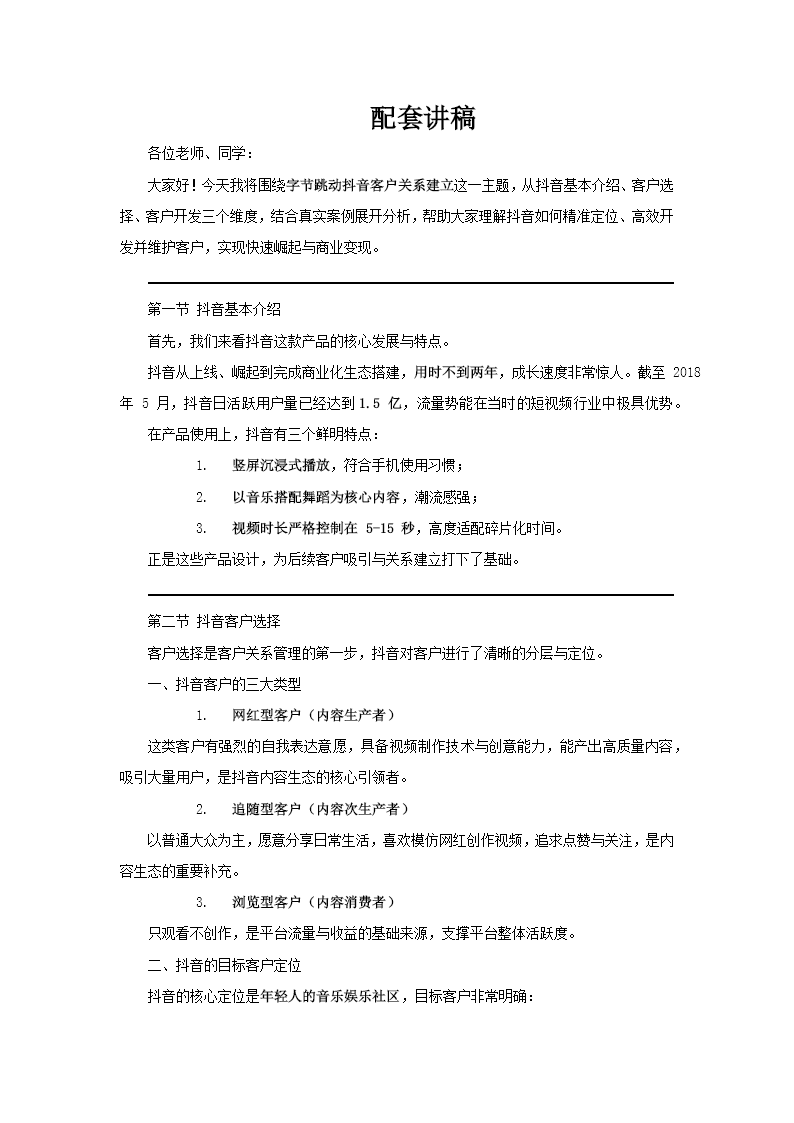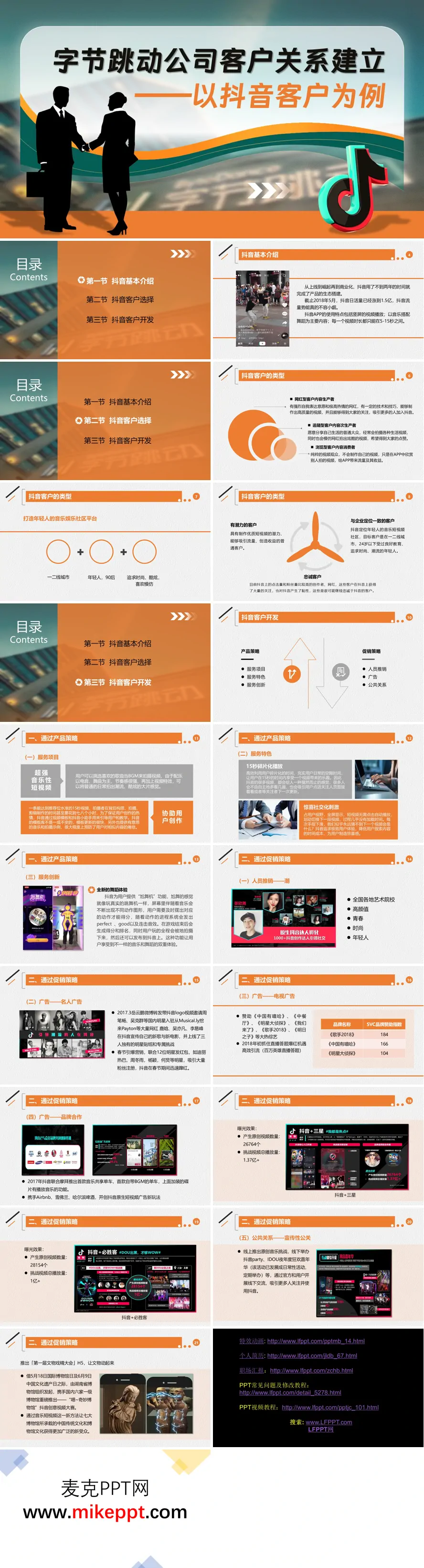 这套PPT的核心内容是关于字节跳动公司如何以抖音为例建立客户关系。其逻辑结构清晰,主要分为三大部分:抖音基本介绍、抖音客户选择与抖音客户开发。 第一部分是抖音基本介绍。这部分通过数据展示了抖音的快速崛起,例如提到其上线不到两年就完成生态搭建,并于2018年5月日活用户达到1.5亿。图片强调了其产品特点,如竖屏播放、音乐舞蹈为主的内容及5-15秒的短视频时长,旨在阐明其作为“年轻人的音乐娱乐社区平台”的定位基础。 第二部分是抖音客户选择。PPT将抖音用户区分为三种主要类型:网红型客户(高质量内容生产者)、追随型客户(模仿分享的次生产者)以及浏览型客户(纯内容消费者)。在客户选择策略上,图片重点突出了目标客户群体是来自一、二线城市、追求时尚潮流的年轻人,并将“有潜力的客户”、“与企业定位一致的客户”以及“忠诚客户(现有高粉丝量创作者)”作为重点目标。 第三部分是抖音客户开发,这是PPT的核心,详细阐述了产品与促销两大策略。产品策略方面,图片展示了“超强音乐性短视频”、“协助用户创作”等服务项目,以及“15秒碎片化播放”、“惊喜社交化刺激”和“全新的舞蹈体验(尬舞机)”等服务特色与创新,旨在提升用户体验和创作热情。促销策略的展示更为丰富,包含多张图片:通过“人员推销”在艺术院校寻找高颜值年轻人;通过“广告”邀请大量明星(如岳云鹏、迪丽热巴等)入驻或合作、赞助热门综艺节目(如《中国有嘻哈》、《歌手2018》等)、与品牌(如摩拜单车、Airbnb、三星、必胜客)进行联合营销,并展示了合作带来的视频播放量等曝光数据;还通过“公共关系”举办线上线下活动(如IDOU夜、文物戏精大会H5),以扩大品牌影响力。 总而言之,这套PPT通过图文结合的方式,系统性地阐述了抖音的产品定位、用户画像以及一套从产品体验到明星代言、综艺赞助、品牌联名到事件营销的多元化、立体化客户开发与增长策略。