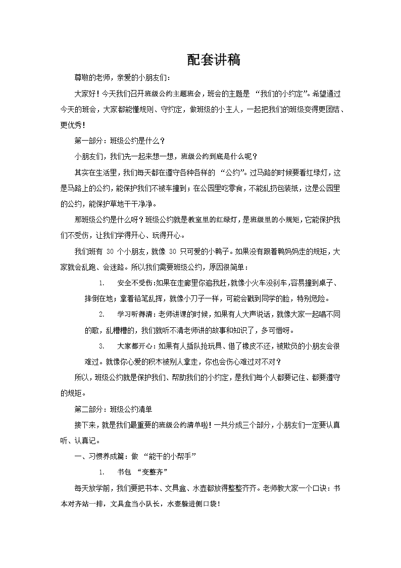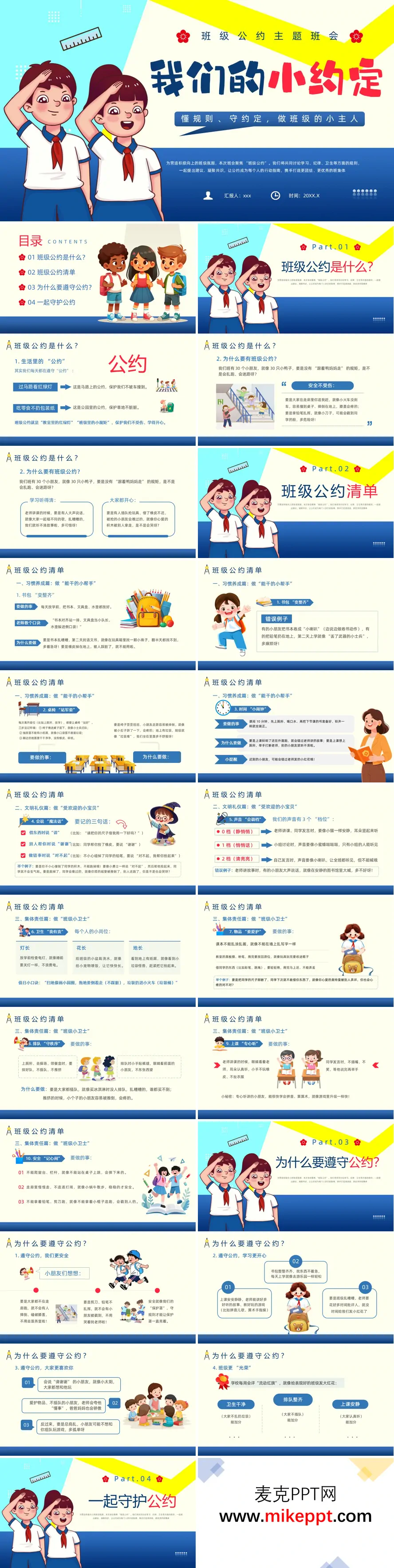 这套PPT旨在向小学低年级学生介绍“班级公约”是什么、包含哪些内容、为什么要遵守以及如何共同遵守。整个PPT的风格童趣可爱,运用了大量的比喻、拟人和情景化语言,方便孩子理解。 PPT的开头用生活中的例子(如交通信号灯、不乱扔垃圾)引出班级公约是“教室里的红绿灯”,是保护大家安全、让学习更开心的小规矩。接着,将30个同学比作30只小鸭子,生动地说明了公约能带来安全、良好的学习环境和友好相处的快乐。 核心部分是“班级公约清单”,分为三大部分,共列出了10条具体、可操作的公约: 1.习惯养成篇:包括整理书包(书本对齐、文具收好)、离开时让桌椅归位、以及利用好课间十分钟做好准备,旨在培养孩子的自理能力和时间观念。 2.文明礼仪篇:强调使用“请、谢谢、对不起”等礼貌用语,以及根据场合(如听讲、讨论、发言)灵活调节自己的音量(0档静音、1档讨论、2档发言),教导孩子基本的社交礼仪。 3.集体责任篇:这部分内容最丰富,包括承担班级小岗位(如灯长、花长)、爱护公物与同学物品、排队守秩序、上课专心听讲以及牢记各项安全准则(不攀爬、不追逐、不挥动尖物),培养孩子的责任心和集体荣誉感。 在解释了“为什么要遵守公约”时,PPT从个人安全、学习效率、受欢迎程度以及为班级争取“流动红旗”等集体荣誉几个方面,说明了遵守公约对每个人的好处。 最后,PPT提出了几个“一起守护公约”的实用方法:包括每天放学前自我检查、同学间温和友善地互相提醒、通过“班级成长树”贴叶子等正向激励,以及建议在家和父母进行情景模拟游戏来巩固练习。PPT的结尾强调,班级公约是大家共同的小约定,每个人都是班级的小主人。