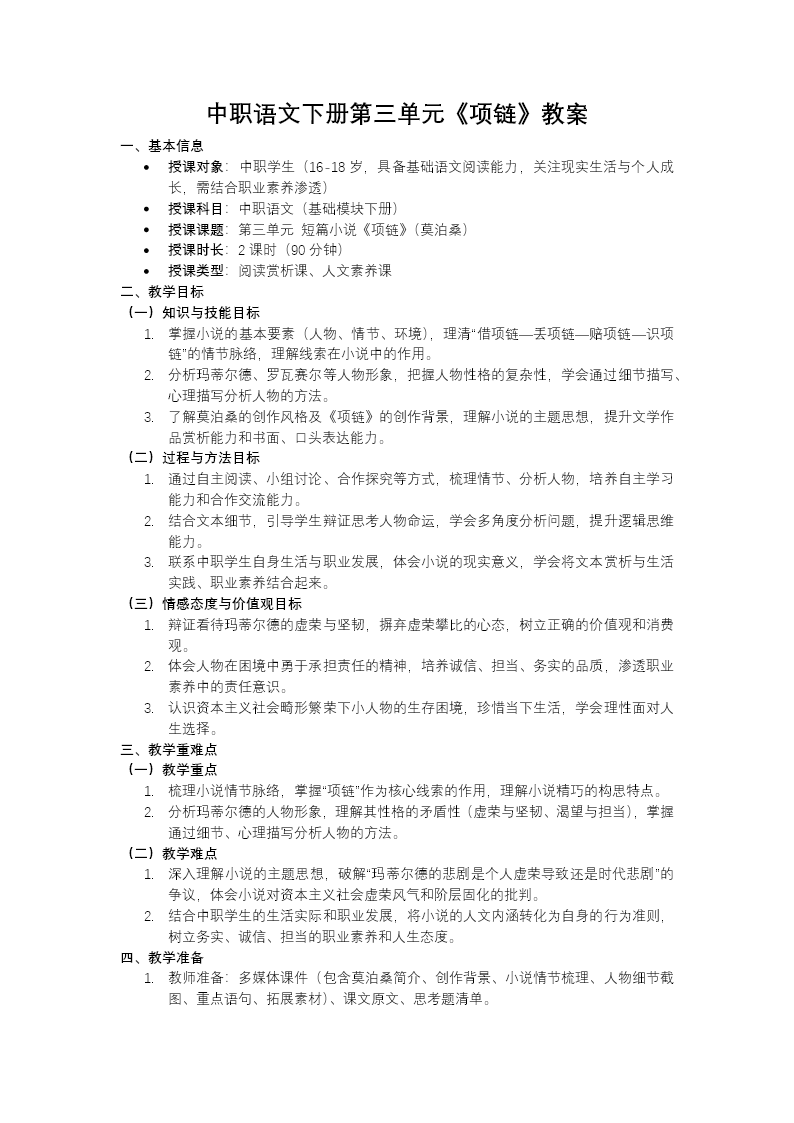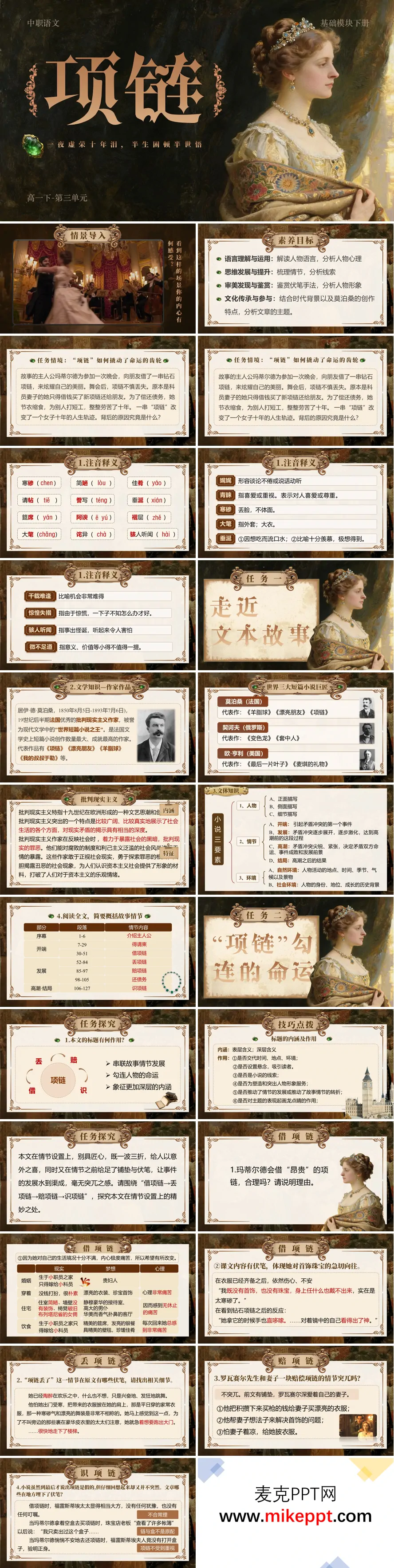 这是中职语文高一下册第三单元莫泊桑小说《项链》完整教学课件,共48页,以"一夜虚荣十年泪,半生困顿半世悟"为主题。 开篇明确素养目标,涵盖语言解读、情节梳理、人物分析、主题探究四大维度。主体分五大任务模块:任务一走近文本故事,梳理字音释义、作者背景、小说三要素,梳理"借项链→丢项链→赔项链→识项链"的完整情节;任务二"项链"勾连的命运,分析标题作用、情节伏笔与欧·亨利式结尾,拆解四个关键节点的艺术巧思;任务三"项链"折射的人性,深度剖析玛蒂尔德、罗瓦赛尔夫妇的人物形象,对比人物前后性格变化,挖掘人性的复杂与成长;任务四主题探究,从社会根源、人性虚荣、命运无常等多维度解读小说主题,批判资本主义社会的拜金与虚荣;任务五主题辩论赛,设置"玛蒂尔德为虚荣付出十年青春是否值得"辩题,布置续写结局的拓展作业。