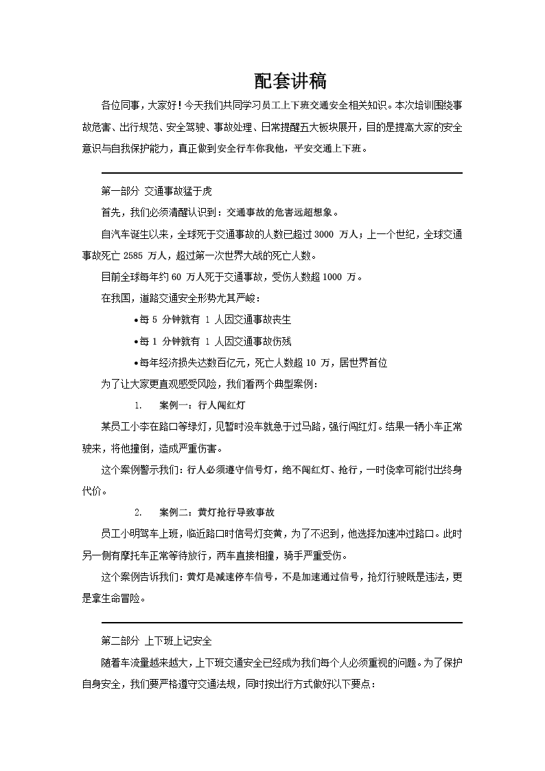 这套PPT是一份以“员工上下班交通安全培训”为主题的培训材料,其核心目标是提升员工的交通安全意识,确保上下班途中的安全。 PPT内容结构清晰,共分为五个主要部分。首先,它通过“交通事故猛于虎”强调了交通事故的严重性与全球性的危害,并用具体数据(如全球年死亡人数、中国每5分钟一人丧生车轮等)和“行人闯红灯”、“黄灯冲红”两个具体案例,警示违反交通规则的惨痛后果。其次,在“上下班上记安全”部分,PPT根据不同出行方式(自驾汽车/摩托车、乘公交车、步行)分别列出了详细的安全注意事项和行为规范,例如自驾要系安全带、骑车戴头盔、公交车上抓稳扶手、步行走人行道等,具有很强的实操指导性。接着,PPT提出了“十不开”的安全驾驶原则,如“不开急躁车”、“不开冒险车”、“不开赌气车”等,以简洁易记的口诀形式归纳了安全驾驶的关键心态与行为准则。然后,在“交通事故会处理”部分,PPT通过流程图和文字说明,介绍了发生事故后的正确处理流程(如停车、救人、报警、保护现场)以及车内人员如何自救(如保护头部、避免二次伤害、车辆落水逃生等),旨在提升员工的应急处理能力。最后,PPT以“安全时常挂心间”作结,通过一首“交通安全歌”将各类安全规则口诀化,并再次呼吁“珍爱生命,安全出行”,强化了培训的主题。 整体而言,这套PPT从事故警示、日常预防、驾驶守则、应急处理和口诀总结等多个层次,系统性地构建了员工上下班期间的交通安全知识体系,图文结合,旨在让安全观念深入人心。